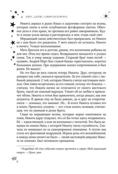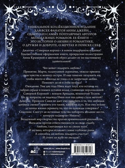 Her books are stories of love and romance, friendship and kindness, dreams and finding yourself. Artistic design of the book, beautiful illustrations by Anna Krymova and color cropping make it truly amazing! The "Northern Crown" dilogy in a new gift edition. What can love give? Acceptance. Martha, a talented violinist, has a hard time accepting her feelings for her sister's fiancé. And it's even harder to stifle them so that no one will ever know about her forbidden love. Will music help her? Waiting. For two years Nika has been waiting for the man who left her, taking her heart and in return leaving the necklace that became her personal Northern Crown, the crown of Ariadne, abandoned by Theseus. But is Nicky's hope in vain, or has it long since become a dream? Trust. Sasha's past prevents him from believing that the girl he loves will be able to accept him for who he is. Or does he need to hide what he once did for the rest of his life? Salvation. Can true feelings overcome the desire for revenge Nikita is planning? The airy world of creativity versus criminal reality. Fatalism versus responsibility for one's fate. Love that sweeps away everything in its path. And music that heals the deepest wounds. But can love give happiness? And is it worth following the stars...?