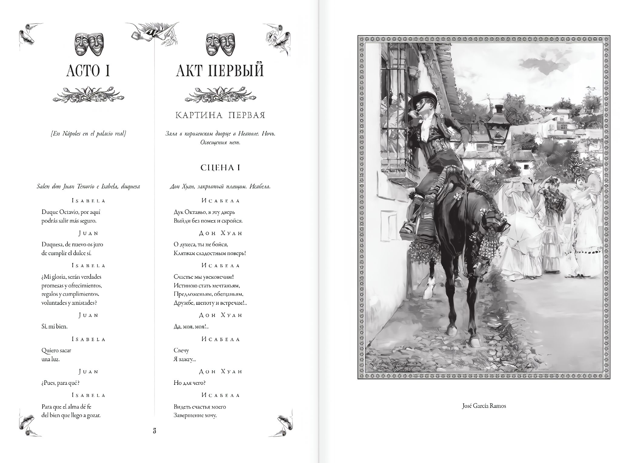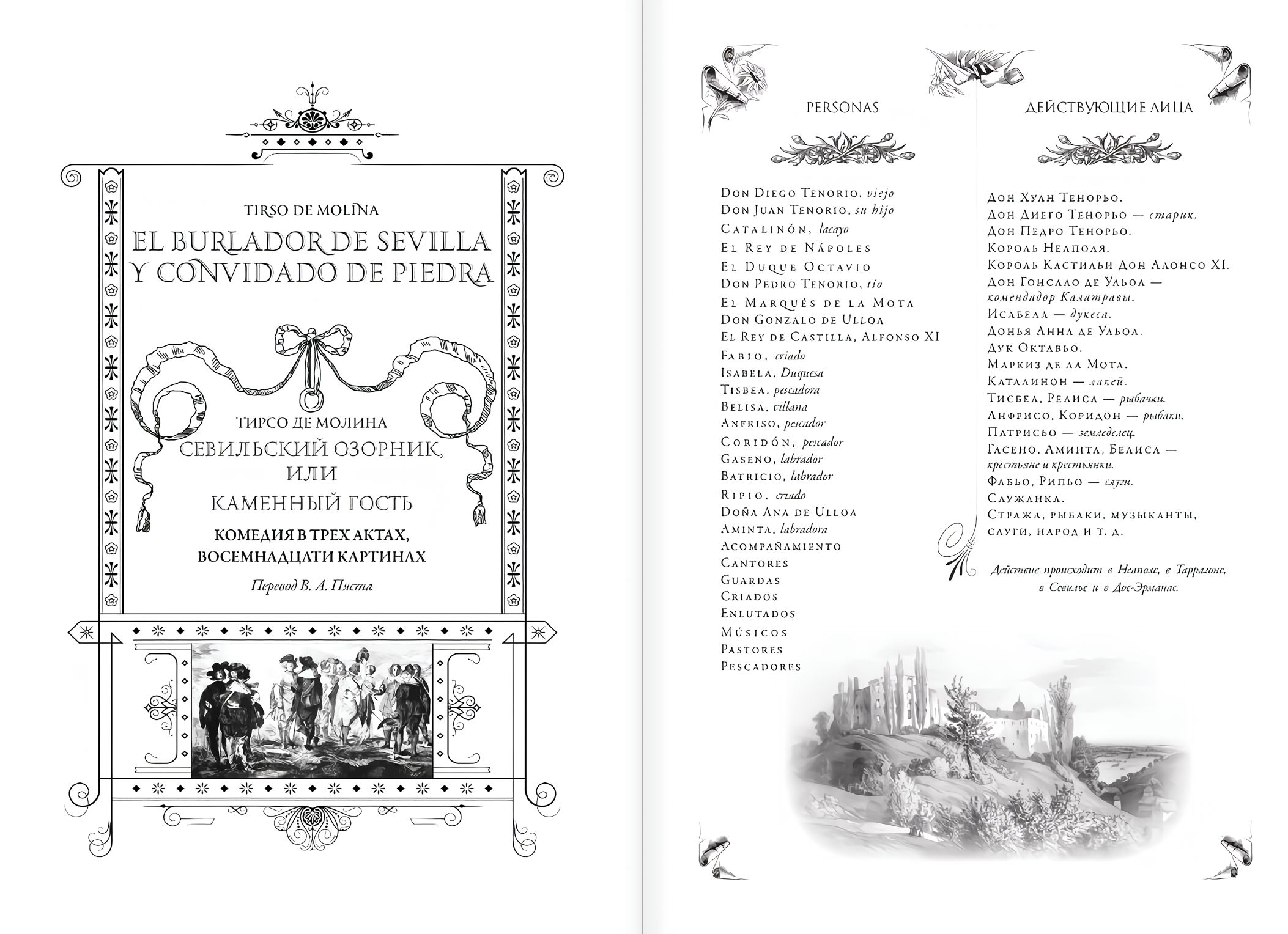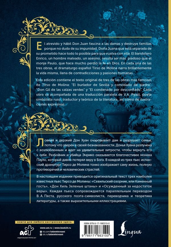 This edition contains the original text of Tirso de Molina's three most famous plays: "The Seville Prankster, or the Stone Guest", "Don Gil Green Trousers" and "Condemned for Lack of Faith". Each play is accompanied by a parallel translation by V. A. Pyast, a Russian symbolist poet, translator and literary theorist, as well as expressive illustrations.