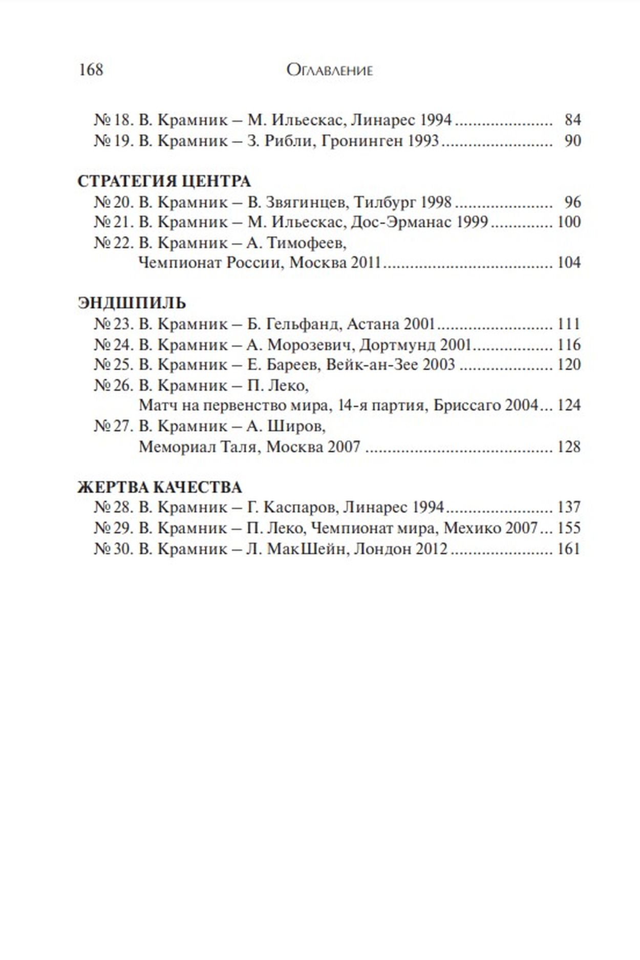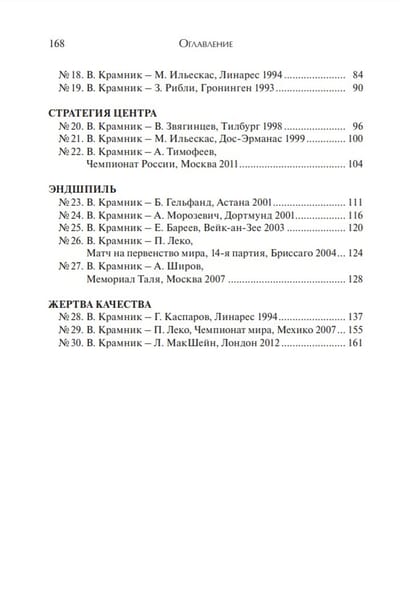 The fourteenth world champion Vladimir Kramnik is a bright representative of the classical direction in chess art. His work harmoniously combines a subtle understanding of the position, impeccable mastery of combination weapons and polished endgame technique. 30 games of V. Kramnik, presented in this book and commented by grandmaster S. Guliev, will give readers great aesthetic pleasure. For educational purposes, the games are divided into thematic sections, each of which is preceded by a short introduction