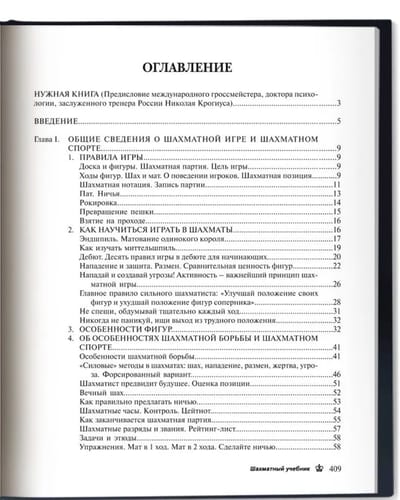 It offers a systematic course in chess (excluding openings), including general information about the game of chess and the sport of chess, various types of advantages in a game, combinations, king attacks, endgame techniques, and the basics of strategy.