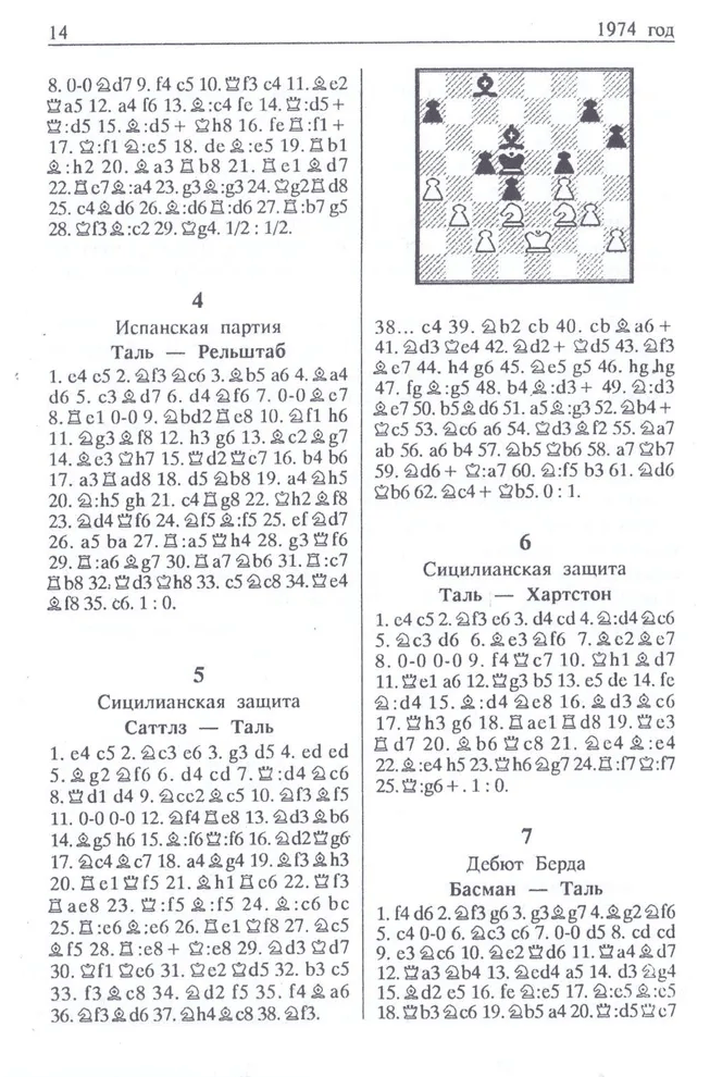 Tal Mikhail Nekhemievich (9.11.1936-28.06.1992) eighth world champion (1960-1961), international grandmaster (1957). Champion of Latvia 1953, 1965. Champion of the USSR 1957, 1958, 1967, 1972, 1974, 1978. Eight-time winner of the World Chess Olympiads as a member of the USSR team, six-time European champion and three-time world champion among students in team competition. Winner of the first unofficial World Blitz Championship (1988). Winner of inter-zonal tournaments in 1958, 1964, 1979, the 1959 Candidates Tournament, participant in two world championship matches and seven Candidates matches. He won 44 international tournaments. The most complete collection of M. Tal's games is intended for a wide range of chess fans.