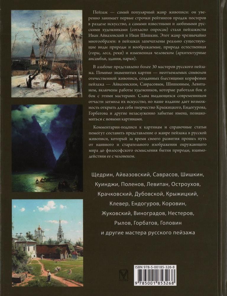 The genre of landscape in Russian painting has evolved from a naive and diligent depiction of the surrounding world to a philosophical understanding of the existence of nature and its interaction with man. This album introduces the most famous, popular with the viewer landscapes created by Russian artists during two centuries (mid XVIII - early XX century). For a wide range of readers.