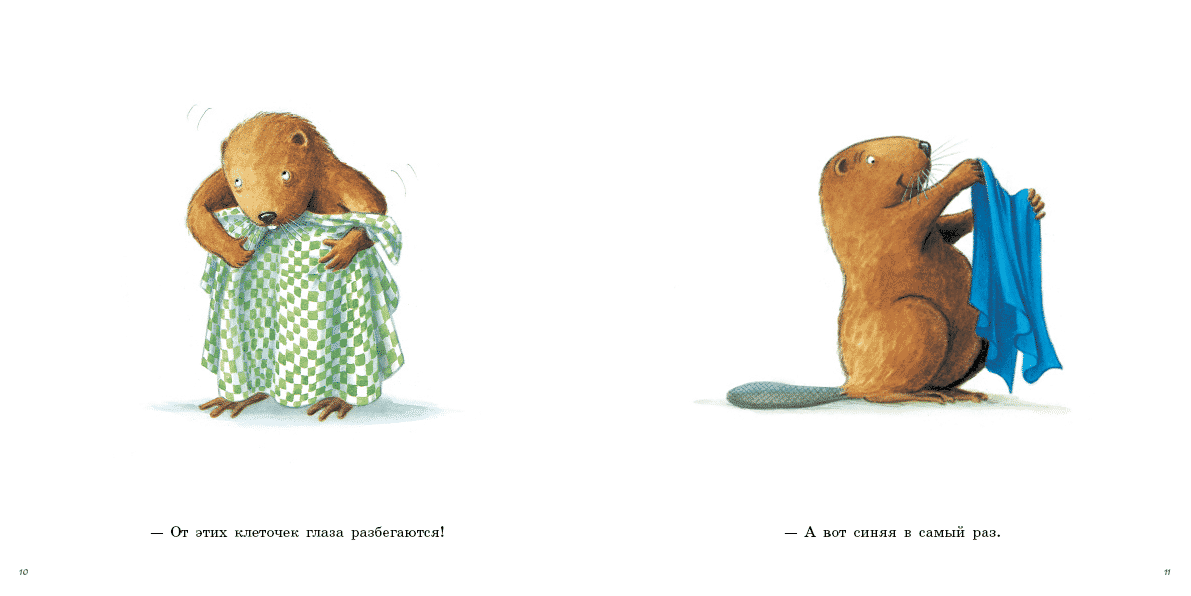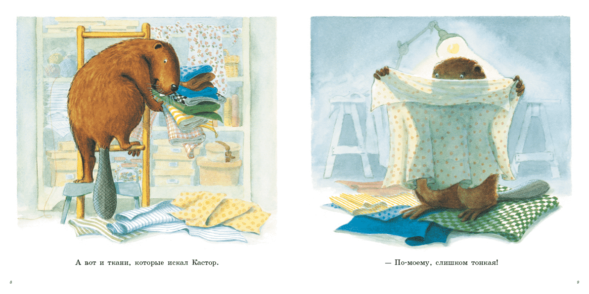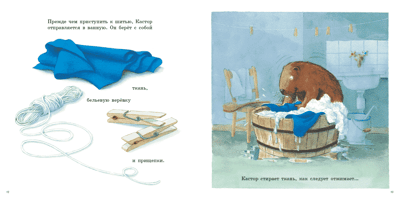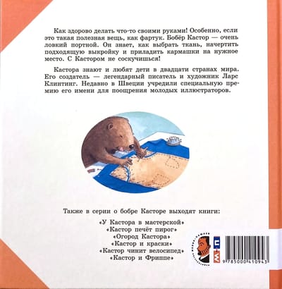 Castor's old work apron is completely worn out, so he decides to make himself a new one. Castor sets to work with all his usual thoroughness: he chooses the fabric, prepares it for cutting, draws the pattern on paper, transfers it to the fabric, carefully cuts it out, then bastes the pieces, tucking the edges, and finally stitches it on a sewing machine. It's all very simple! Especially since each step is illustrated in detail, and the necessary pattern is included at the end. In short, with such a book it's hard to resist trying yourself in the role of a tailor.