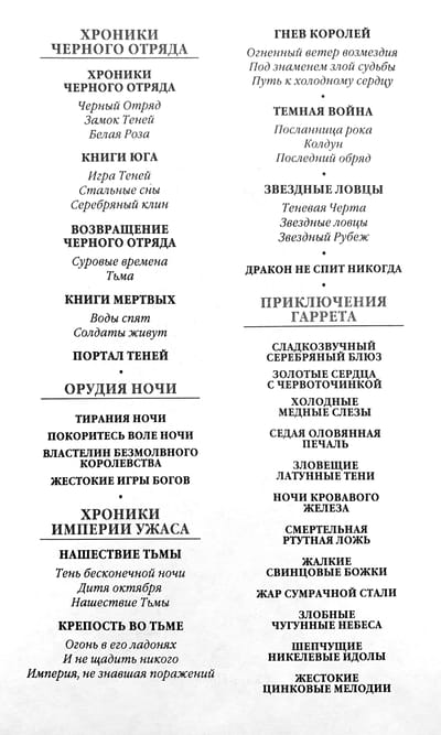If Garrett lived in our world, not in the world of magic, he would be on equal terms with the famous heroes of the "black detective", private investigators Niro Wolfe, Mike Hammer, Philip Marlowe and Sam Spade. But in Tanphere, inhabited not only by humans, but also by elves, pixies, dwarves, trolls and other fantasy creatures, he has no equal. In the novel "Whispering Nickel Idols", having undertaken to find out why the king of the underworld has fallen into a coma, Garrett will enter into a struggle with the daughter of the "king" - and will find that not only this "princess" wants him dead. In the novel Cruel Zinc Melodies, Garrett, already ready to do away with private investigation, is forced to deal with paranormal sabotage. A wealthy brewer's good intention to open a new theater in Tanfer turns into a nightmare: giant-sized bugs and a swarm of ghosts have appeared in the building under construction. And if only they threatened the peace and life of the citizens! Teenage gangs are running rampant in the hot neighborhood, and the families living in the most respectable area are far from innocent in their intellectual and magical entertainments.
