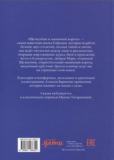 Christmas Eve is a time of mystery and magic, gifts and miracles, when the most incredible things can happen. "The Nutcracker and the Mouse King" is Hoffman's most famous fairy tale, published for over two centuries, it was the basis for Tchaikovsky's most magical ballet and has been screened many times. Full of mystery and magic, it leads readers between dream and reality, revealing a world of animated dolls, battles and curses, honor and nobility. Good Marie, the brave Nutcracker, the hideous Mouse King, and the mysterious godfather Drosselmeyer await you in the pages of this book. Thanks to the atmospheric, detailed and colorful illustrations by Alexei Barinov, a familiar story comes to life before our eyes.