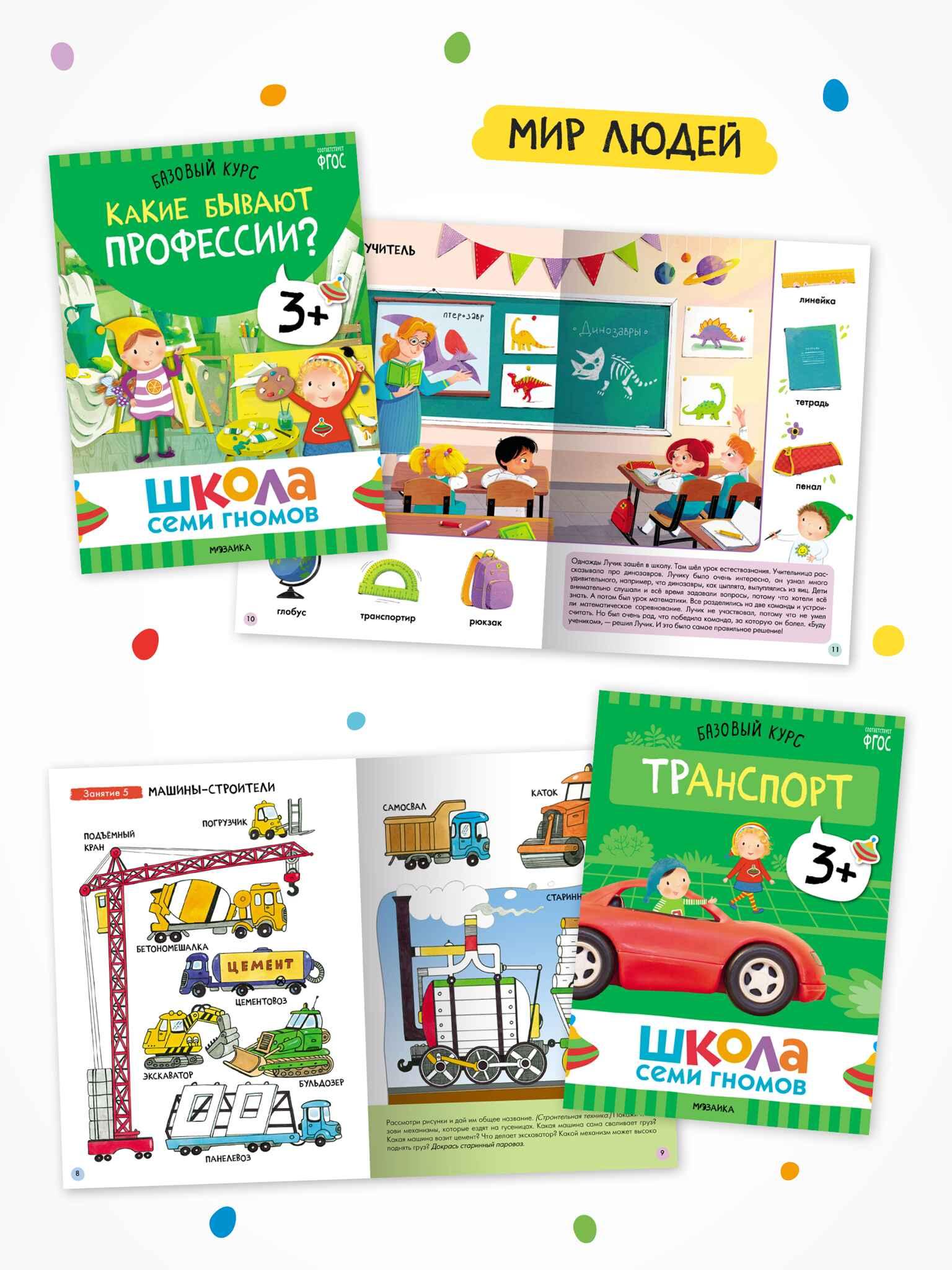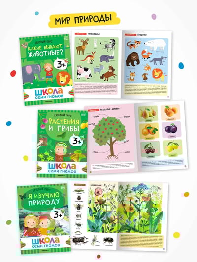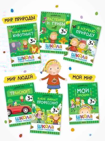 The School of the Seven Dwarfs is a system, not a set of books. This 12-book set is designed for the comprehensive development of a child. Six books develop cognitive abilities: curiosity, thinking, analysis, and drawing conclusions. Another six books teach children about the world around them, its patterns, and interconnections.