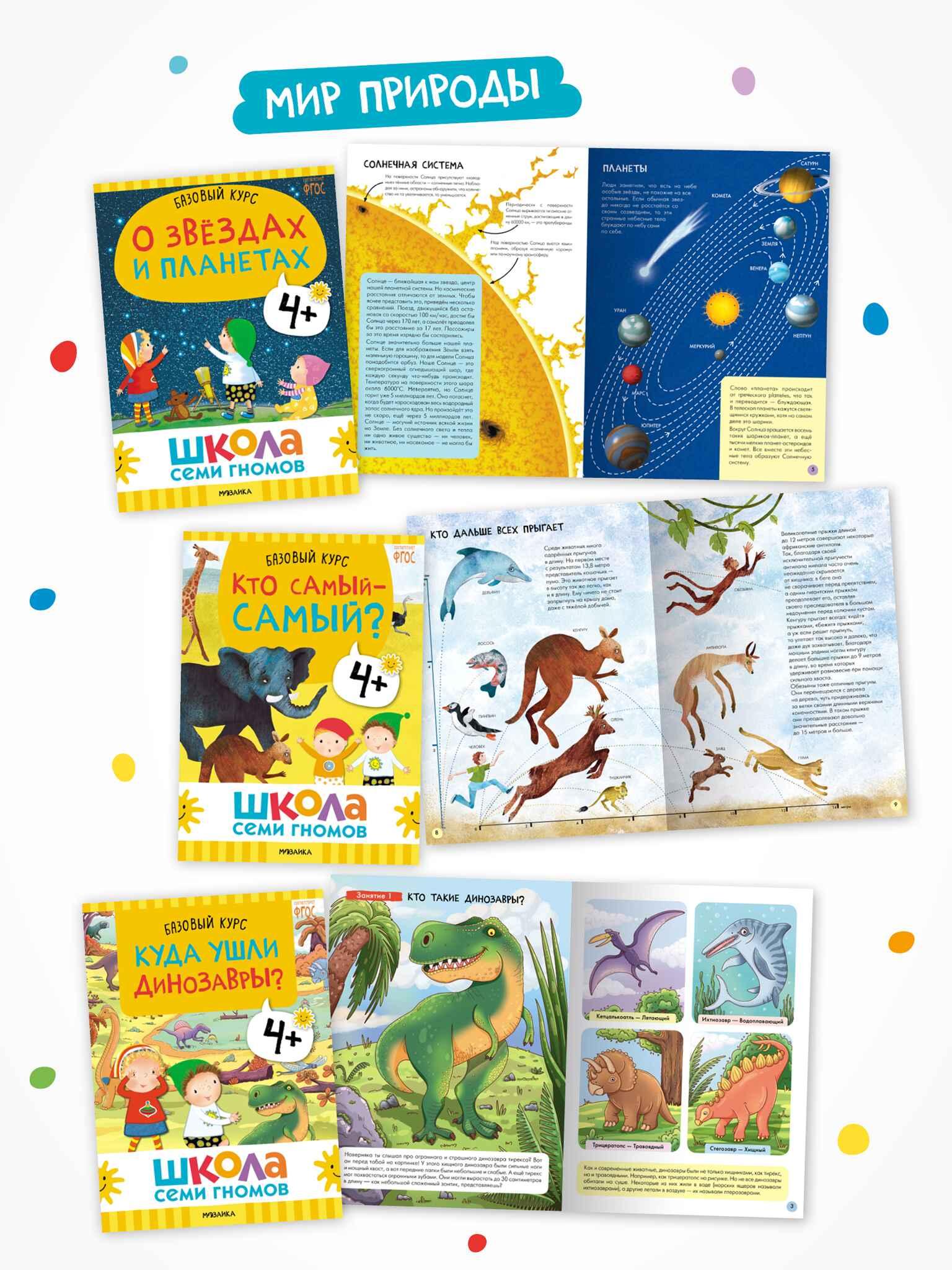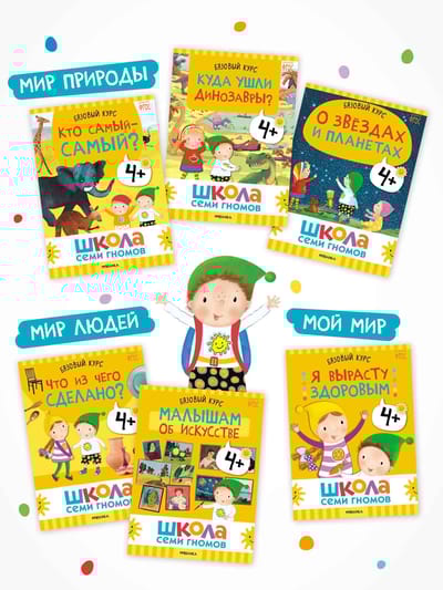 The School of the Seven Dwarfs is a system, not a set of books. This 12-book set is designed for the comprehensive development of a child. Six books develop cognitive abilities: curiosity, thinking, analysis, and drawing conclusions. Another six books teach children about the world around them, its patterns, and interconnections.