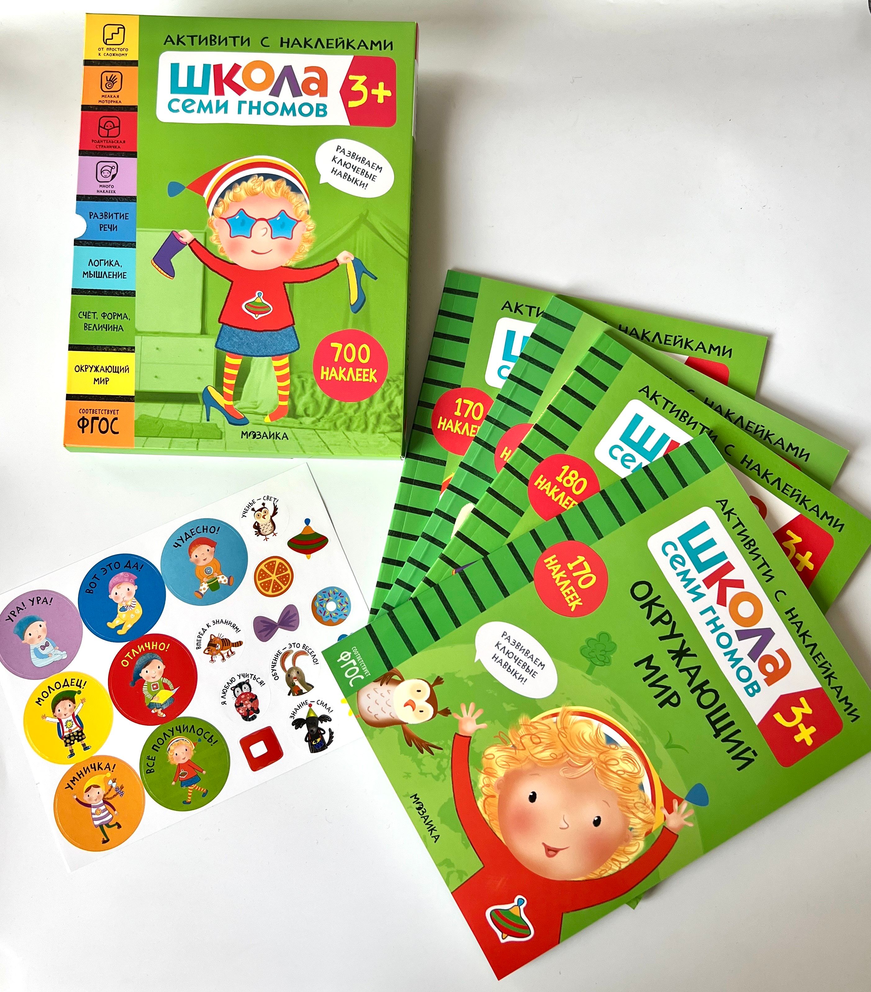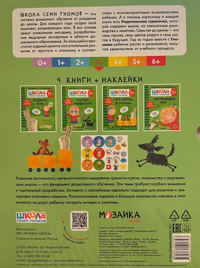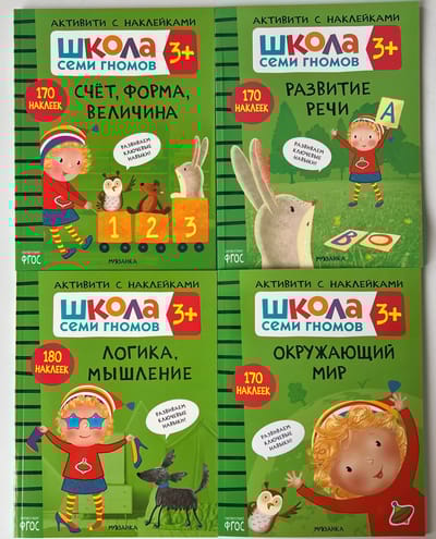 This set includes 4 books that include elements of developmental programs for children aged 3 to 4 years. Reusable stickers on durable film maintain the child's interest in the activities, and the parent page in each book provides clear instructions for adults. A sheet of encouraging stickers makes the learning process even more exciting.