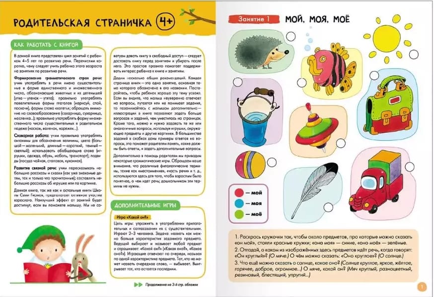 The Basic Course consists of 6 books on the main areas of development (speech, counting, fine motor skills, logic, literacy, thinking) and educational games to consolidate the material (playing field, chips and game scenarios).
