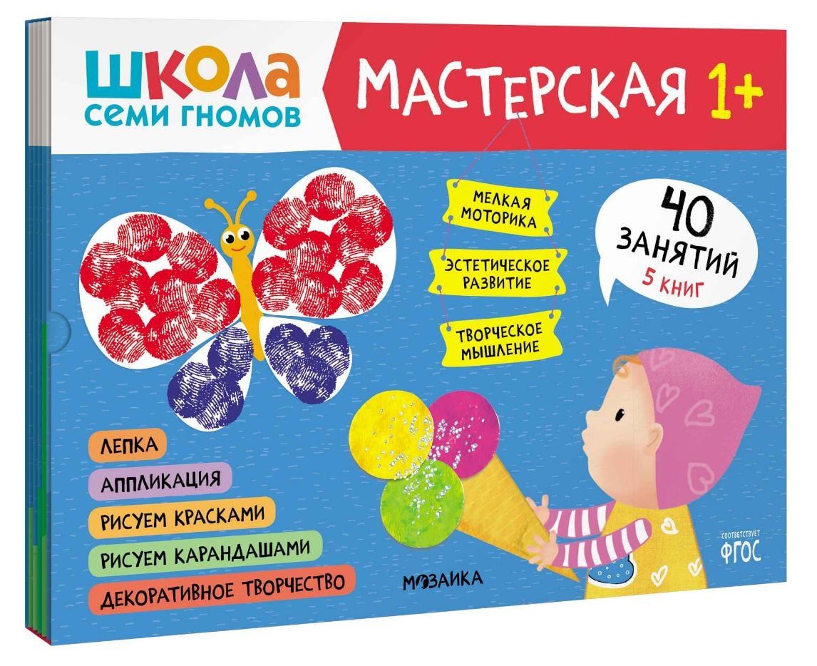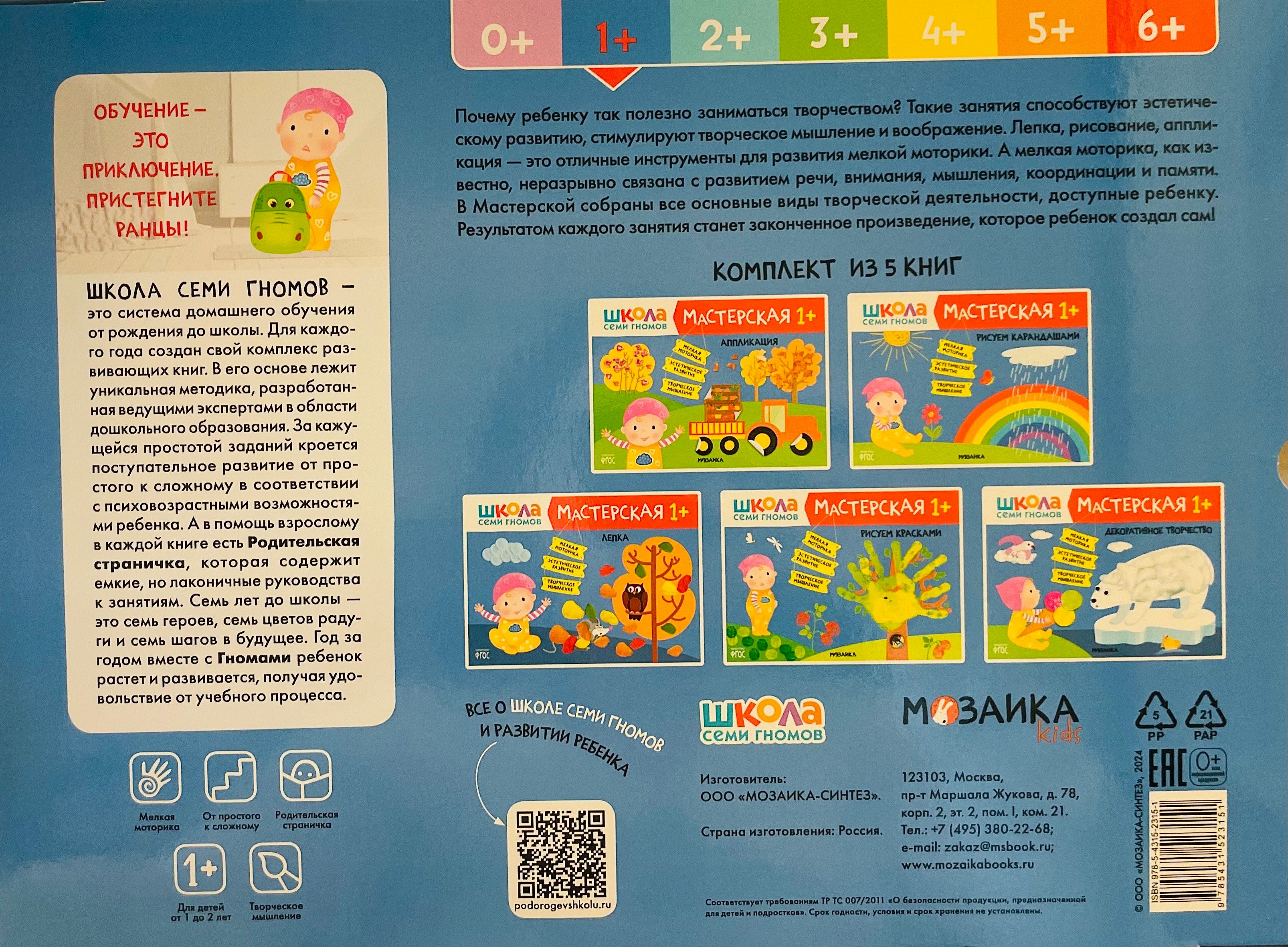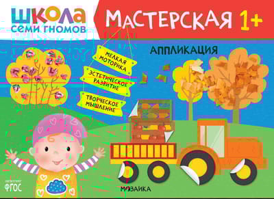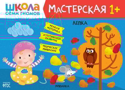 "School of the Seven Dwarfs. Workshop 1+" is a set of colorful albums for exciting creative activities with children aged 1 to 2 years. Activities on topics that are close and understandable to the child are arranged in order of complexity: gradually moving from mastering simple skills to more complex tasks. The result of each lesson will be a finished work that the child created himself. At the end of the album, a large final task awaits the little artist, where he will be able to apply all his new skills.