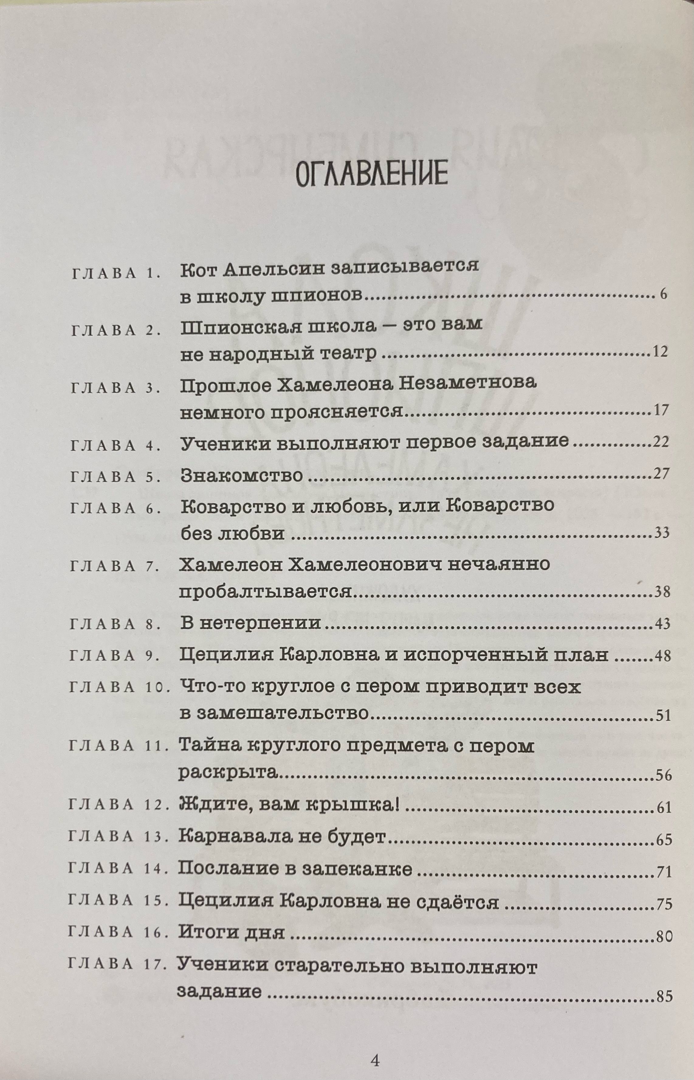 When a spy school opens its doors in your city, what else can you do? That's what Orange the Cat, Mandarin Duck, White Crow, Peacock, Giraffe, and Tiger thought at the same time. Their teacher, Chameleon Chameleonovich Nezametnov, has to make these bright personalities skilled at hiding in plain sight, behaving quietly, and being able to listen and hear. As luck would have it, a mysterious case that urgently needs to be investigated interferes with the educational process: someone wants to disrupt the carnival, the main holiday in the city! Here's a job for the new recruits of the spy school!
