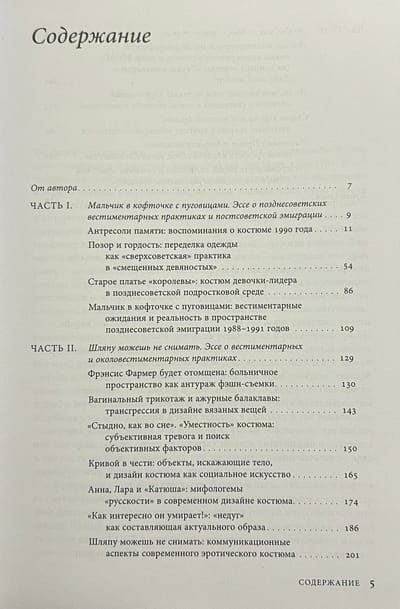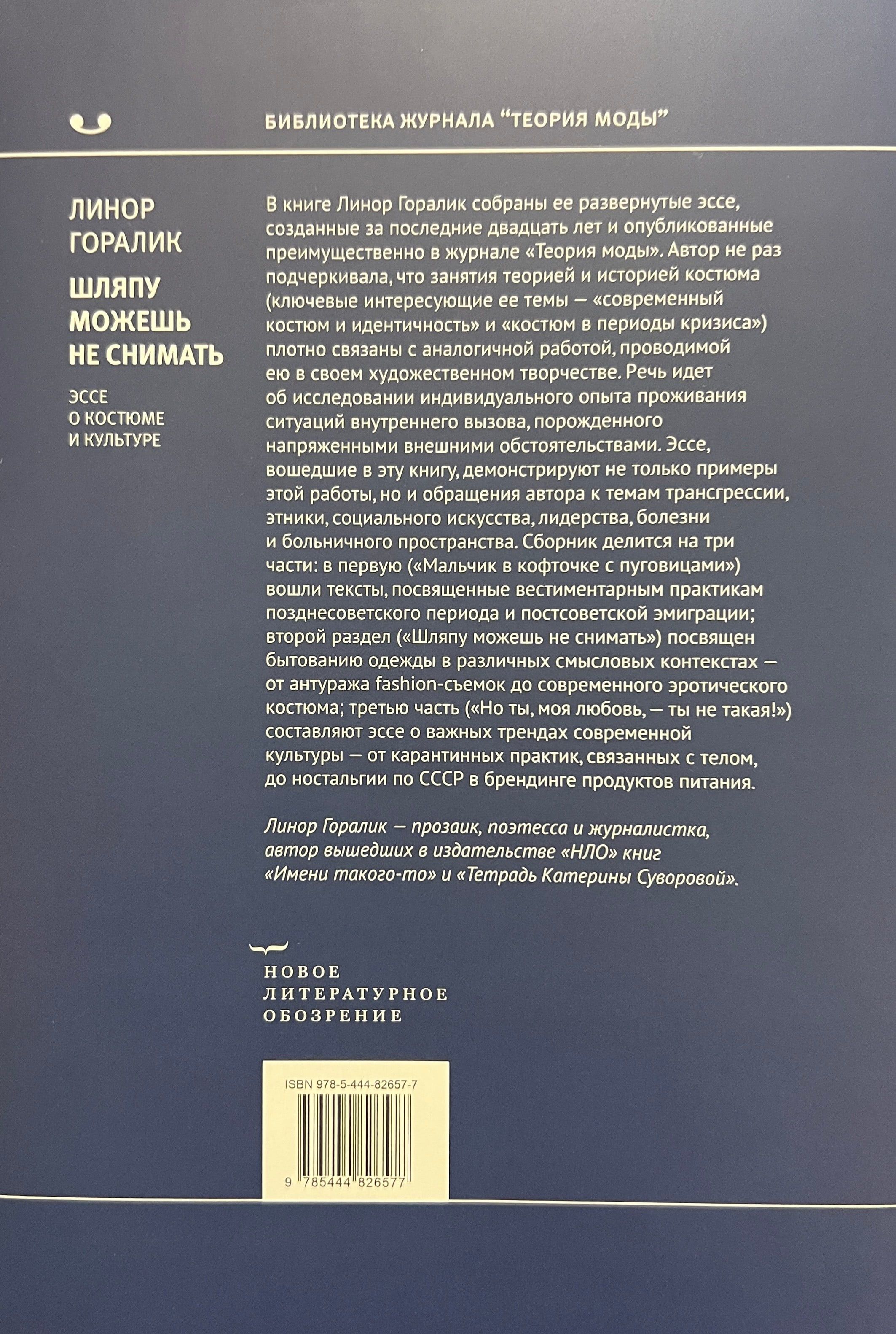The collection is divided into three parts: the first ("Boy in a Blouse with Buttons") includes texts dedicated to the vestimentary practices of the late Soviet period and post-Soviet emigration; the second section ("You Don't Have to Take Off Your Hat") is dedicated to the existence of clothing in various semantic contexts - from the entourage of fashion shoots to modern erotic costume; the third part ("But you, my love, you are not like that!") consists of essays on important trends in modern culture - from quarantine practices related to the body to nostalgia for the USSR in food branding. Linor Goralik is a prose writer, poetess and journalist, author of the books "Named by Such and Such" and "Notebook of Katerina Suvorova", published by "New Literary Review".
