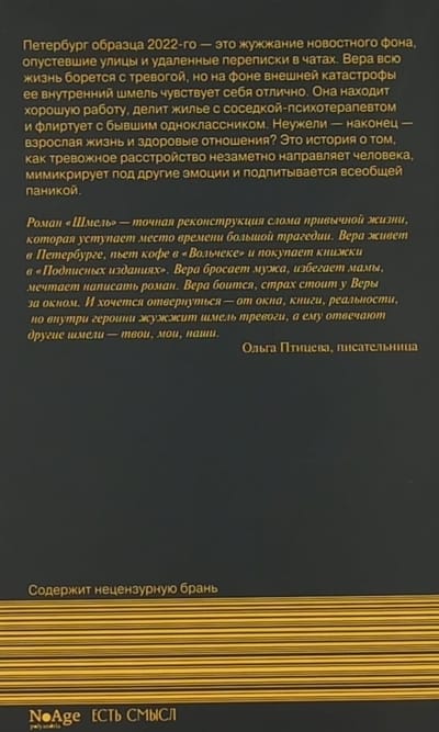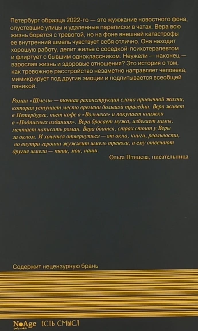 Petersburg in 2022 is a buzzing news background, empty streets and deleted chats. Vera has been struggling with anxiety all her life, but against the backdrop of an external catastrophe, her inner bumblebee feels great. She finds a good job, shares an apartment with a psychotherapist neighbor and flirts with a former classmate. Is this finally adulthood and a healthy relationship? This is a story about how anxiety disorder imperceptibly directs a person, mimics other emotions and feeds on general panic.