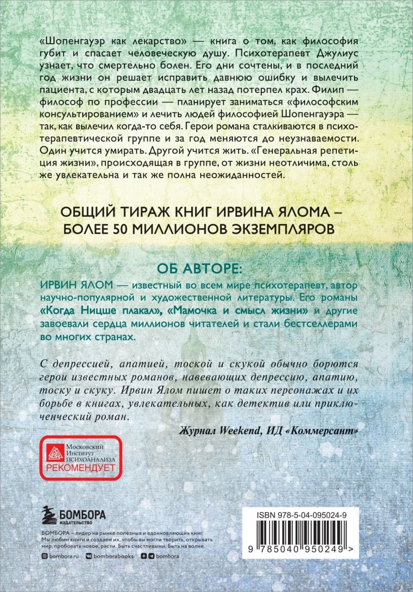 Julius, an experienced psychotherapist, learns that he is terminally ill. His days are numbered, and in the last year of his life he decides to correct a long-standing mistake and cure a patient with whom he failed twenty years ago. Philip, a philosopher by profession and a misanthrope by vocation, plans to practice "philosophical counseling" and treat people with Schopenhauer's philosophy - the way he once cured himself. The two encounter each other in a psychotherapy group and change beyond recognition within a year. One learns to die. The other learns to live. The "dress rehearsal of life" that takes place in the group is indistinguishable from life, just as exciting and just as full of surprises.