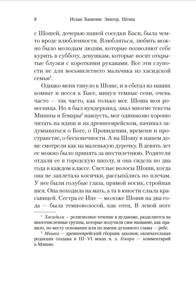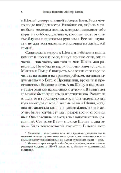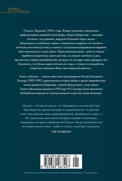 Poland, Warsaw, 1930s. The air is filled with anxious premonitions of a global catastrophe. Aaron Greidinger is a young writer, the son of a rabbi, leading a bohemian lifestyle. Entangled in love affairs and creative failures, he tries to write a mystical play and, together with other Warsaw Jews, awaits the inevitable end of the world. One spring day, walking through the poor Jewish quarters of his childhood, he decides to look into the house where his first love lived, whom he had not seen for twenty years. It turned out that Shosha had been waiting for him all these years and, as if by magic, retained her former appearance as a simple-minded girl... The novel Shosha is the most famous work of Isaac Bashevis Singer (1902-1991), an amazing love story and a vivid testimony to the life of pre-war Warsaw, wiped off the face of the earth by the Nazis. After the publication of the English version of the novel in 1978, I. B. Singer was awarded the Nobel Prize for "the emotional art of storytelling." The text was originally published in Yiddish under the title "Expeditions of the Soul," but during the translation into English it was significantly changed and revised by the author, who subsequently insisted that the English version be used for translations into other languages. In this edition, the novel "Shosha" is presented in the classic translation from English by Nina Broomberg.