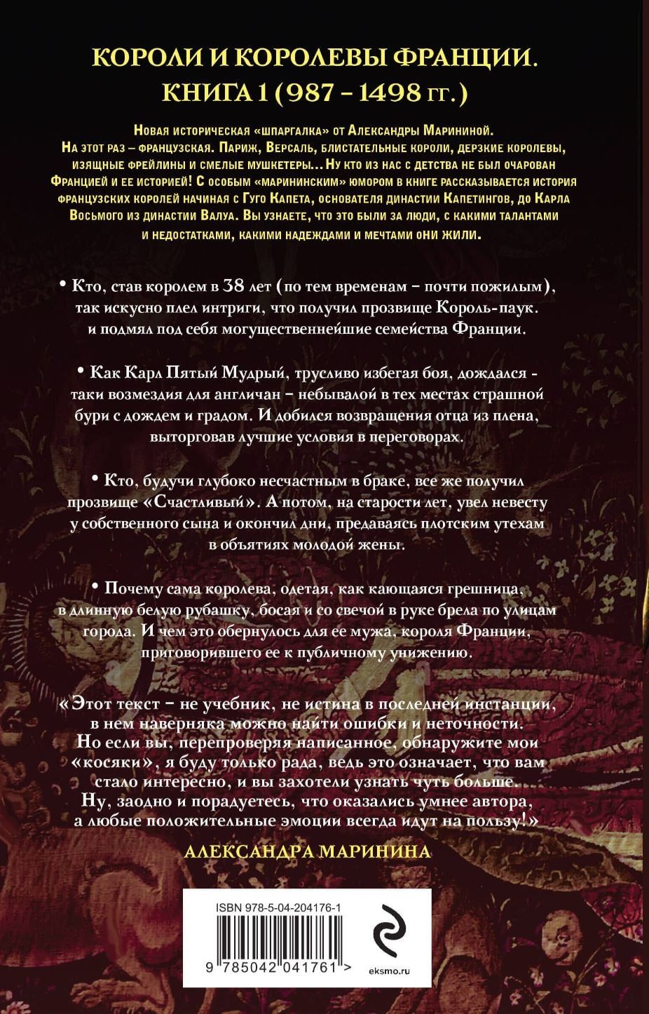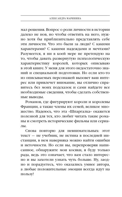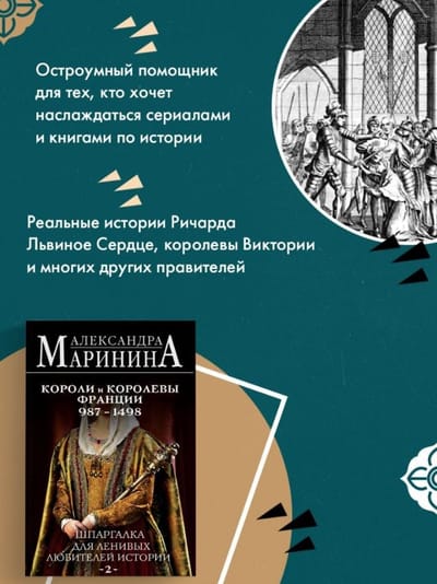 A new historical cheat sheet from Alexandra Marinina. This time, it's French. Paris, Versailles, brilliant kings, daring queens, graceful ladies-in-waiting, and bold musketeers... Who among us hasn't been enchanted by France and its history since childhood? With a special Marinina-esque humor, the book tells the story of the French kings, beginning with Hugo Capet, founder of the Capetian dynasty, and ending with Charles VIII of the Valois dynasty. You'll discover who these people were, their talents and shortcomings, and the hopes and dreams they cherished.