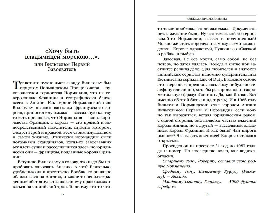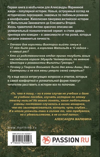 Alexandra Marinina's first book in a genre unusual for her—popular history. It offers a witty new take on historical figures familiar from beloved novels and films. It offers a vivid panorama of English history from William the Conqueror to Elizabeth II. The lives of England's rulers are vividly described as a captivating psychological drama, ranging from drama to thriller to comedy, depending on the roles played by these famous figures. This isn't a history textbook, but a collection of engaging stories that help readers, along with the author, enjoy understanding the curious twists and turns that constantly unfolded in the lives of monarchs. And they can enjoy their favorite historical series and books, understanding everything without getting confused: who ruled whom, who was related to whom, who wronged whom, and who simply ate a siskin.