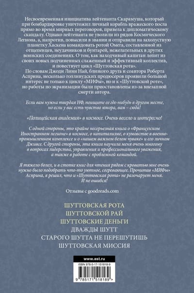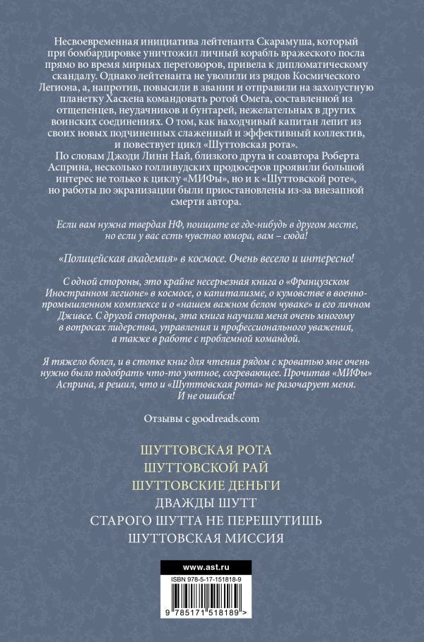 Lieutenant Scaramouche's ill-timed initiative to destroy an enemy ambassador's personal ship during peace talks led to a diplomatic scandal. However, the lieutenant was not dismissed from the ranks of the Space Legion, but, on the contrary, was promoted and sent to the backwater planet of Hasken to command the Omega Company, composed of splinters, misfits and rebels undesirable in other military units. How the resourceful captain molds his new subordinates into a coherent and effective team, and tells the series "Shuttov's Company".