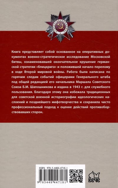 The book is a military-strategic study of the Battle of Moscow, based on operational documents, which marked the final collapse of the German "blitzkrieg" strategy and marked the beginning of a turning point in the course of World War II. The work was written in the immediate aftermath of the events by officers of the General Staff under the general editorship of its chief, Marshal of the Soviet Union B.M. Shaposhnikov, and published in 1943 for official use. Thanks to this, it avoided the ideological layers and later myth-making traditional for Soviet military historiography and retained a purely professional approach to assessing the actions of the opposing sides.