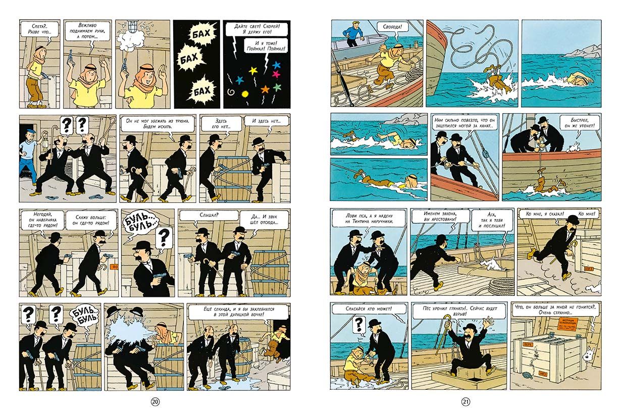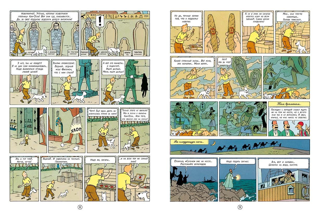 This story begins on a cruise ship where Tintin meets the oddball Philimon Cyclonus, an Egyptologist professor who dreams of finding the tomb of Pharaoh Khi-Oska. Tintin stands up for the scientist to movie mogul Rastapopoulos, and then drugs are planted in his cabin and police officers Dupond and Dupont put him in the hold under arrest. Tintin manages to escape. On shore, he meets the professor and joins his expedition. An ancient papyrus leads them to a tomb, the entrance to which is marked with the sign of Khi-Oska. The exact same sign is on a cigar found by Milou nearby. And in the tomb itself, Tintin discovers a whole warehouse of such cigars! And he also sees there sarcophagi with the mummies of scientists who tried to discover the secret of the pharaoh. And among them three empty - for Tintin, Milu and the professor, who as a matter of course somewhere disappeared ... So Tintin accidentally gets on the trail of an international organization of drug traffickers. Fate throws him first in the Arabian desert, and then in India, where he manages to neutralize the top of the gang, except for the mysterious ringleader, who found death at the bottom of the gorge. But the story does not end there. Its continuation awaits us in the next volume "Blue Lotus". "The Adventures of Tintin" - world-famous series of comic books by Belgian artist Georges Remy, who worked under the pseudonym Hergé. Investigating mysterious incidents, the young reporter Tintin finds himself in the "hot spots" of the planet, where important events occur. Hergé's stories are full of secrets, mysteries and unexpected turns. At every step his hero is under danger. But thanks to ingenuity, courage and resourcefulness Tintin emerges victorious from any trouble. And no matter what happens his faithful friend - snow-white foxterrier Milu - is always by his side.