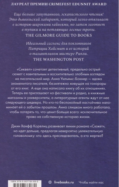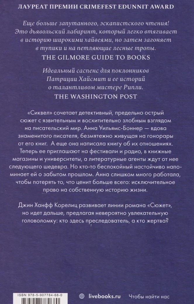"Sequel" combines a thrilling, suspenseful detective story with a caustic, delightfully wicked look at the literary world. Anna Williams-Bonner is the widow of a famous writer, living comfortably on the royalties from his books. She has also written a book about their relationship. Now she's invited to festivals and radio shows, bookstores and universities, and literary agents are eager for her next masterpiece. But someone restless insistently reminds her of her forgotten past. Anna has worked too hard to lose what she values most: the exclusive right to her own life story.
