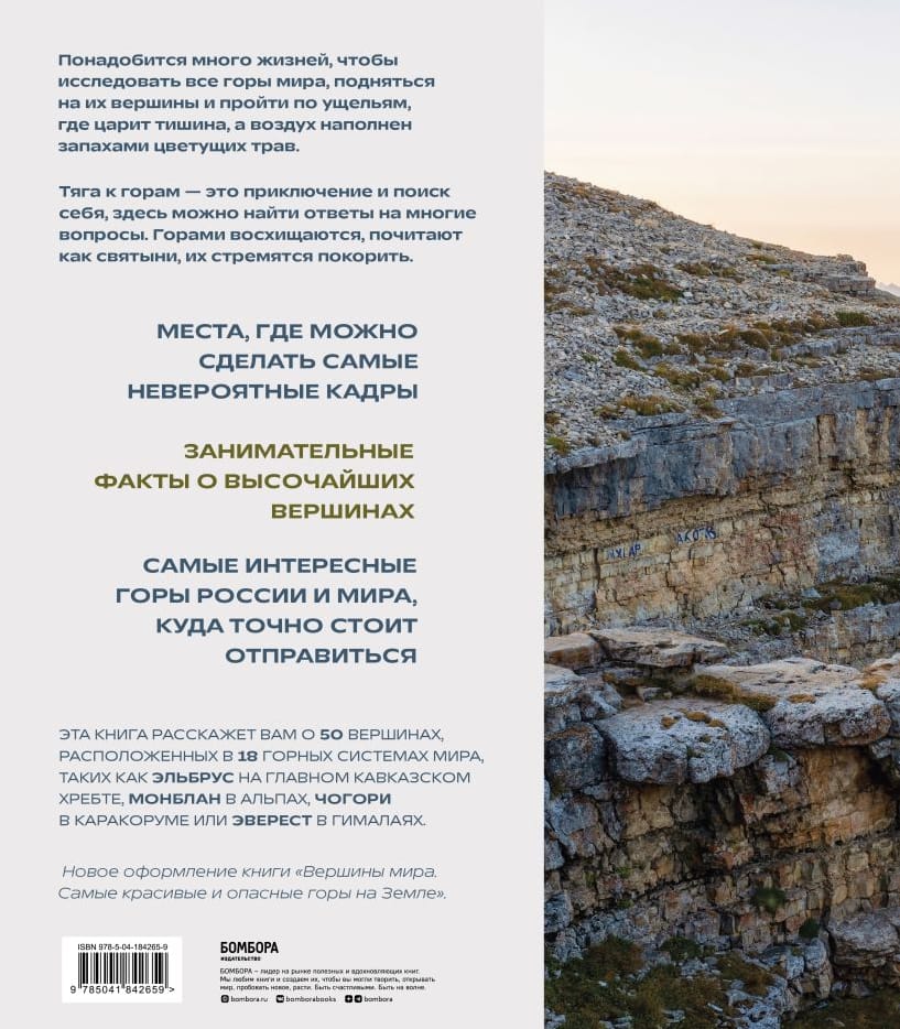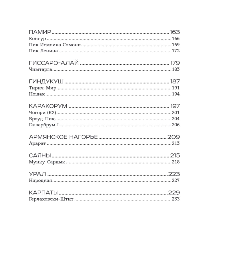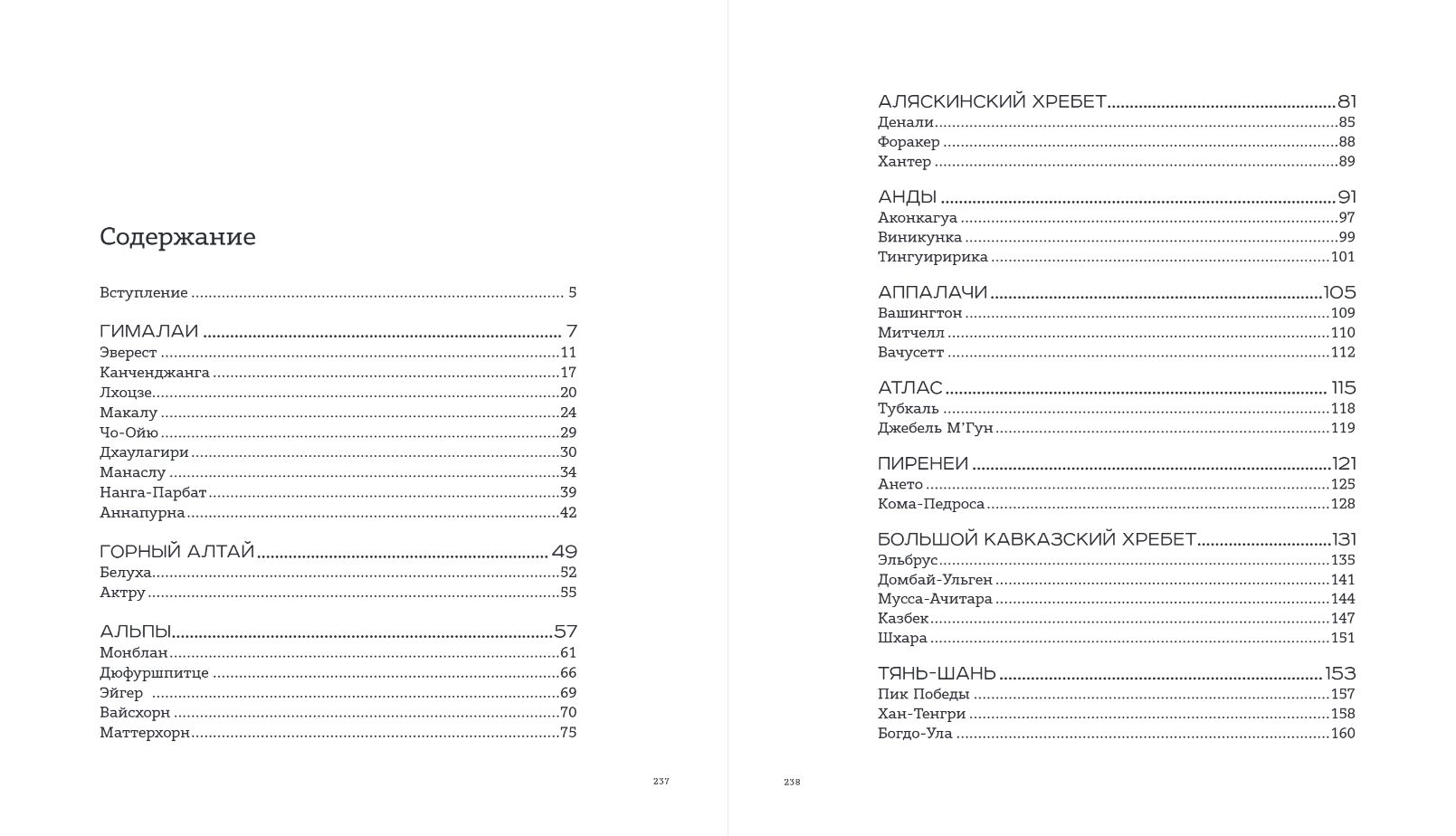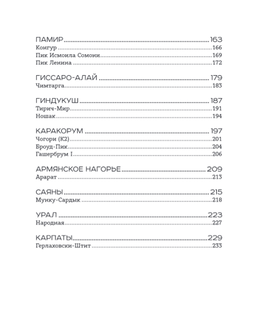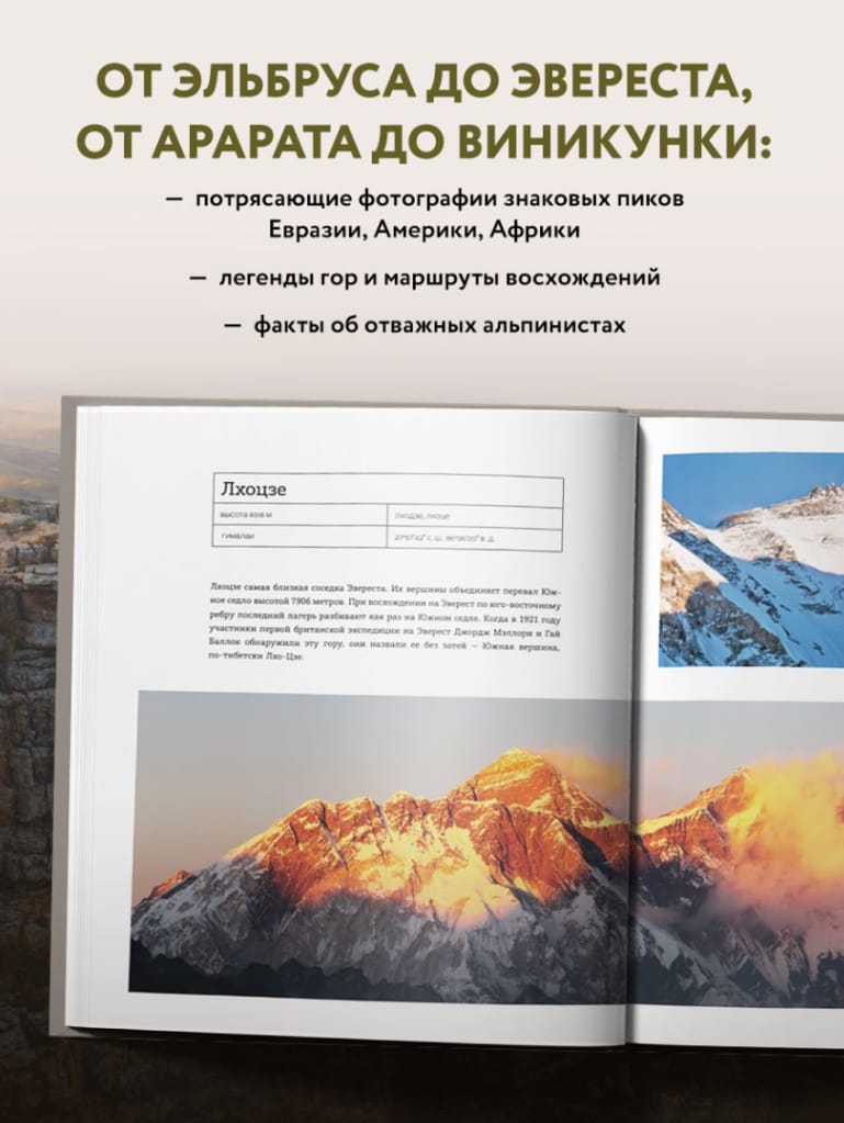 This book will tell you about 50 peaks located in 18 mountain systems of the world, such as Elbrus on the Main Caucasus Range, Mont Blanc in the Alps, Chogori in Karakorum or Everest in the Himalayas.