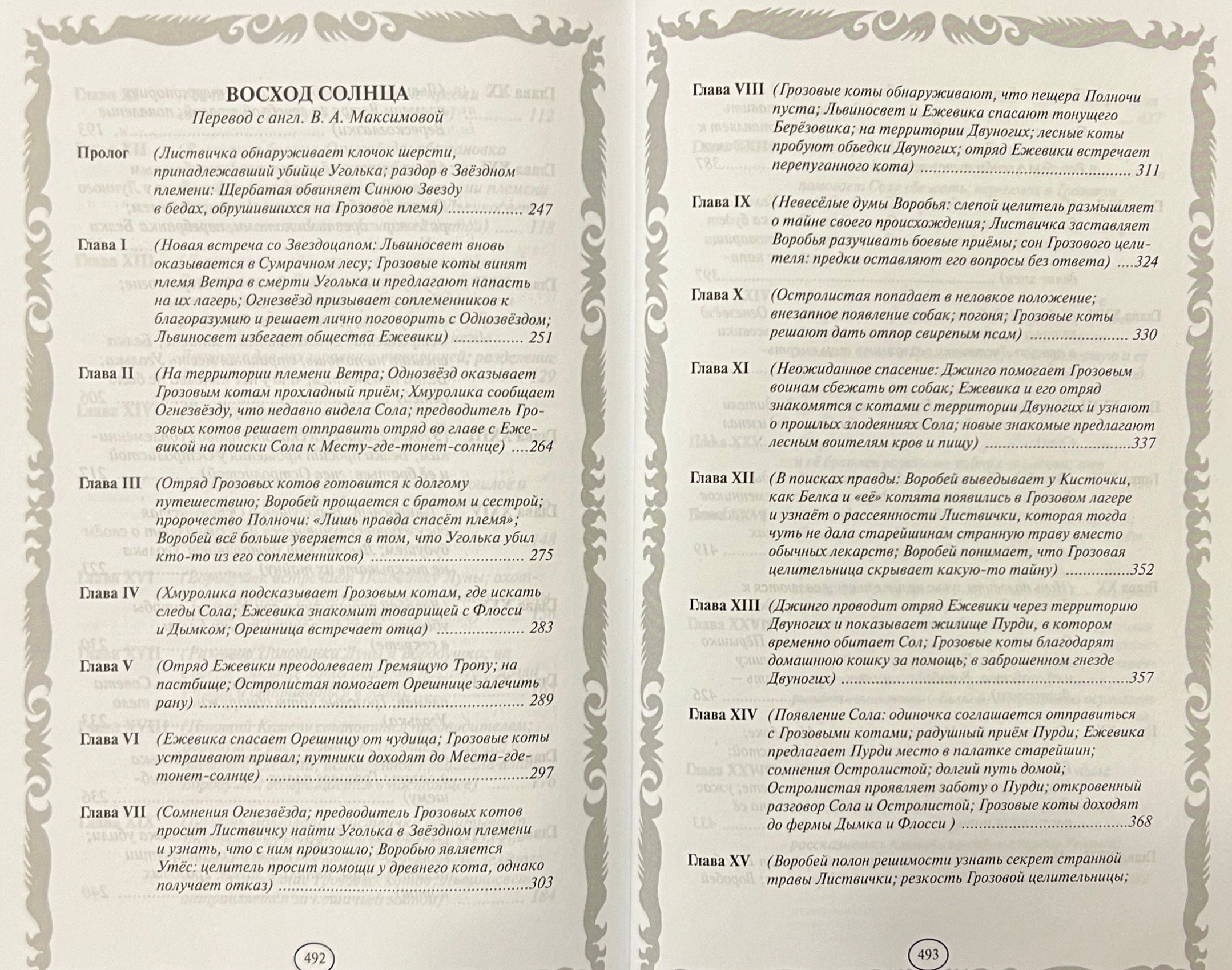 The seventeenth book in the Long Shadows series tells of new problems in the lives of ThunderClan. In their hour of trial, they once again become convinced that their leader Firestar is ready to sacrifice his life for his comrades. At the same time, ShadowClan succumbs to Sol's charms, changing its attitude towards the warrior code. Hollyleaf, Lionblaze, and Jaypaw figure out how to save their neighbors, but the most severe trials await them ahead, because Firestar's grandchildren discover a secret from the past that can ruin many lives. The eighteenth book, Sunrise, tells of troubled times that ThunderClan is experiencing. The mysterious death of one of the warriors has caused a quarrel among the cats, although his secret remains unsolved. Jaypaw intends to find out the truth about his past. Lionblaze wants to understand the prophecy about the power of Three and is ready to do anything for this. For Hollyleaf, the burden of the secret turns out to be too heavy, and in her anger, she erases from her heart even those she once admired.
