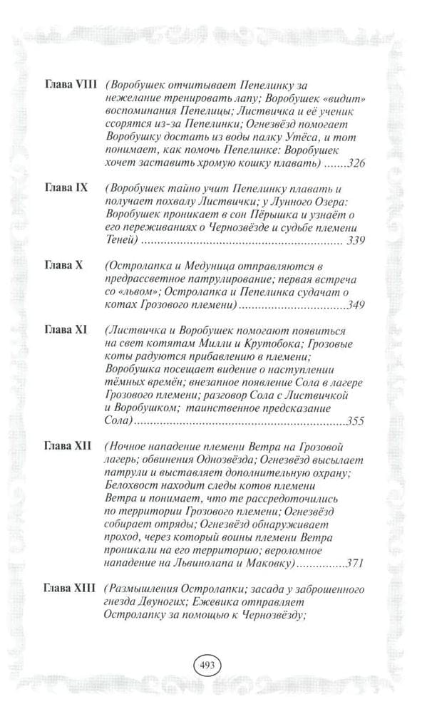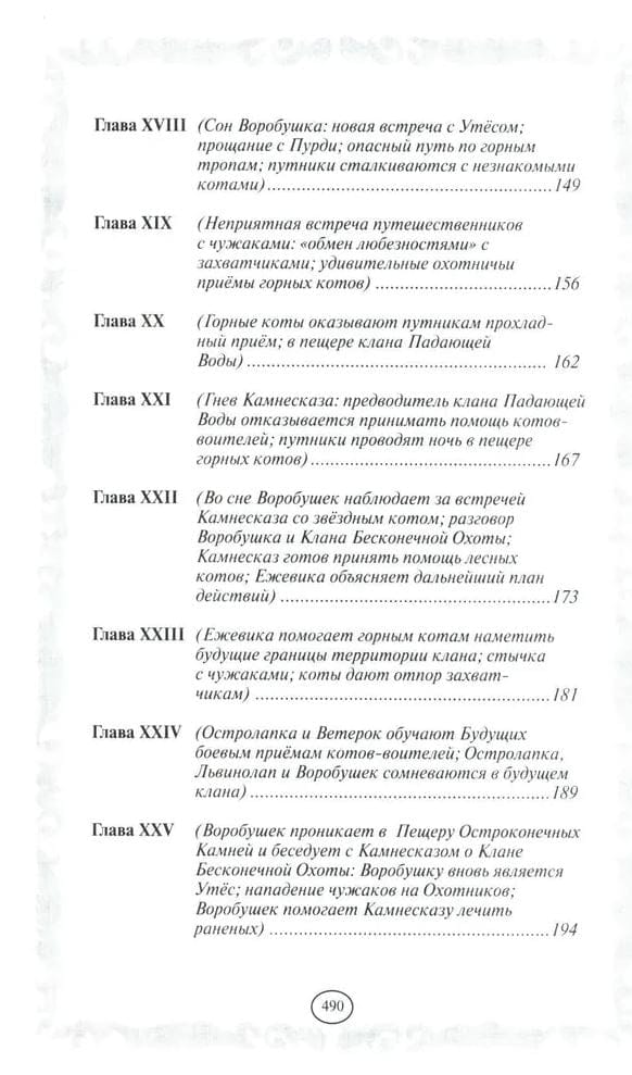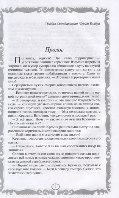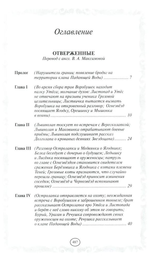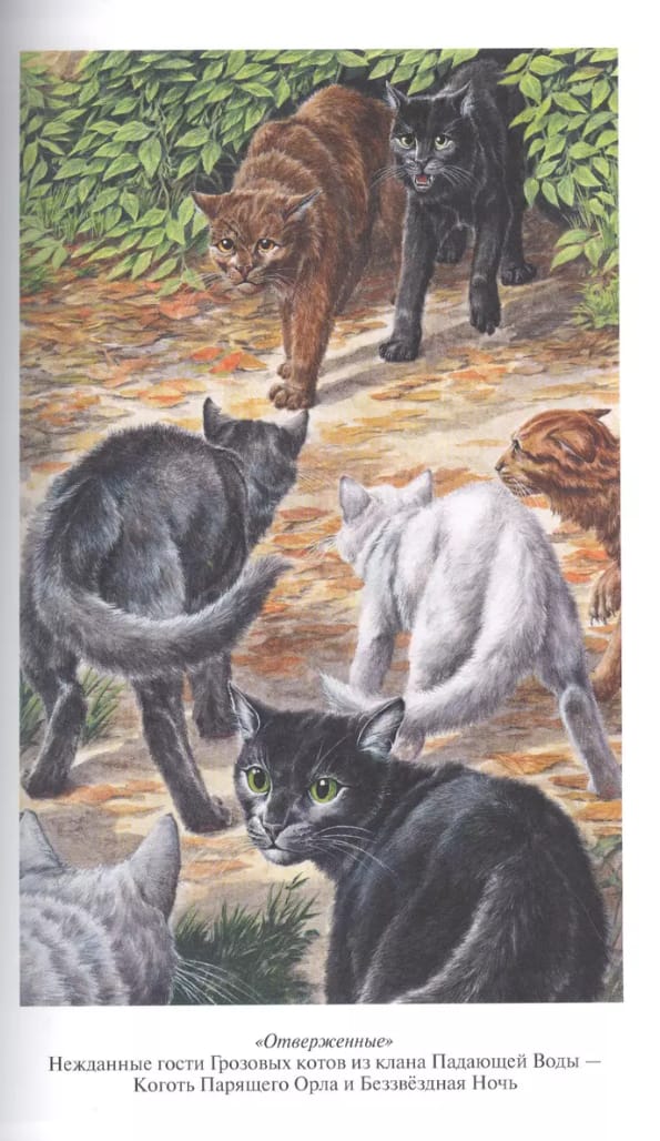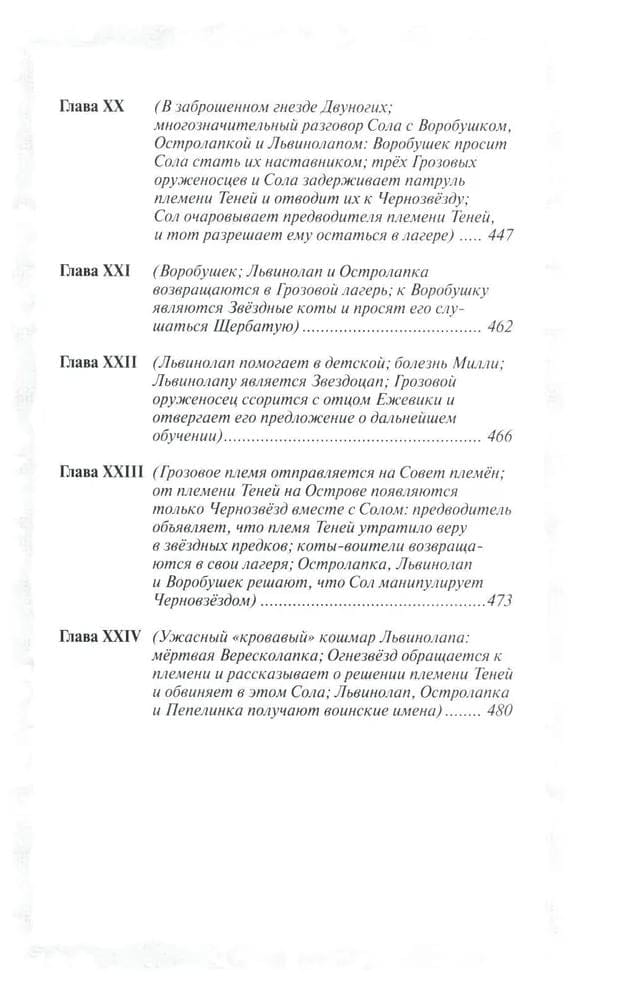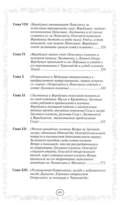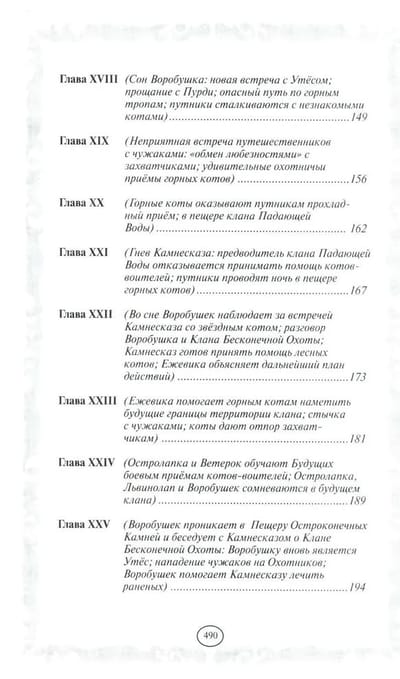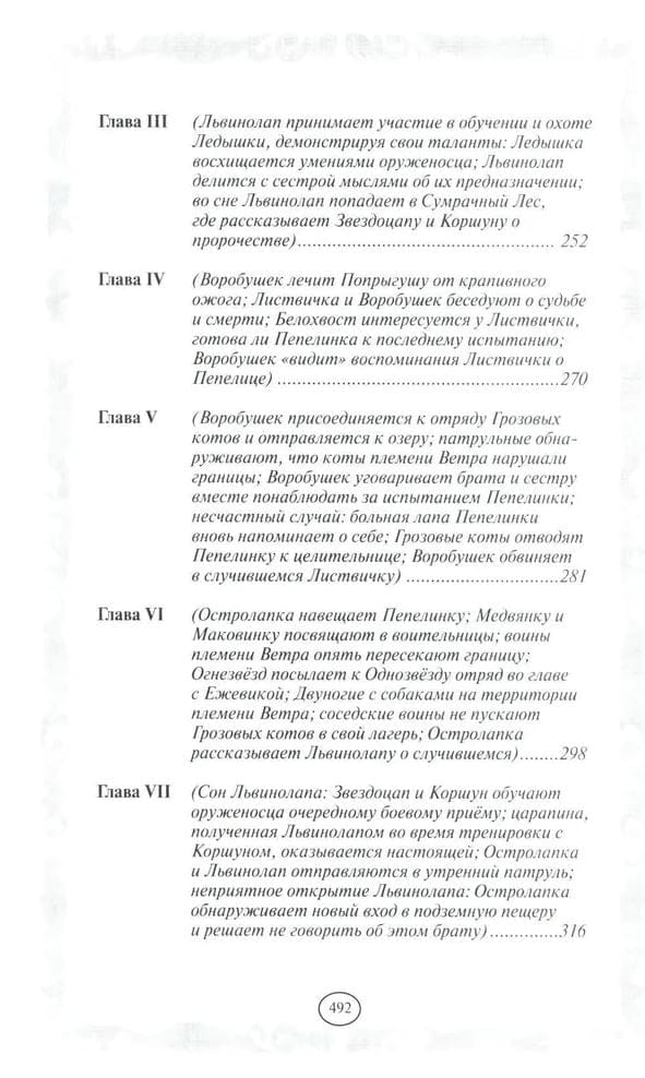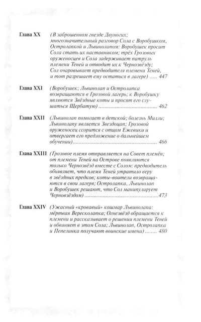 The fifteenth book of the warrior cat series "The Outcasts" tells the adventures of the three grandsons of Firestar. Their fates are bound by a mysterious prophecy, but only one of them - Sparrow - knows about it. He feels an irresistible desire to get to the mountains, where, as the healer's apprentice believes, he will be able to learn not only about the prophecy itself, but also about what happened to the ancient cats that once lived on the shores of the lake. Ostrolapka and Lionpaw are also eager to see the world, and when the Thundercats are asked for help by the representatives of the Falling Water clan, they are given the opportunity. The cats embark on a journey to the distant mountains, not even realizing how dangerous the journey will be....