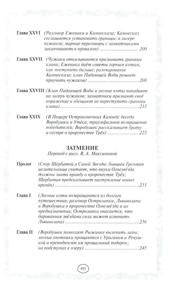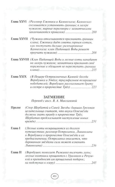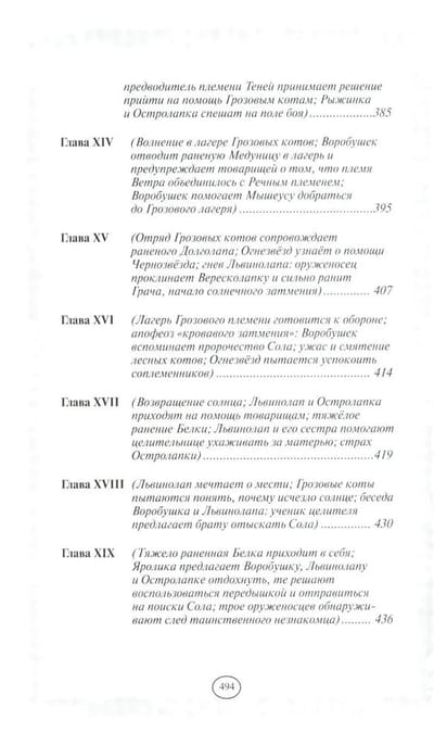 The sixteenth book in the series, "Eclipse", tells how Ostrolapka, Lionpaw and Sparrow, trying to understand what the possession of the "power of the stars" promises them, are burdened with the responsibility for the future of all the tribes. The abilities of the three squires are put to the test when the Thundercats are unexpectedly attacked by someone they could never have expected. All the tribes are drawn into a terrible battle. Darkness thickens over the forest, and a mysterious stranger warns the warrior cats of the coming dangers. It seems that for the first time, the Star Tribe has no answers for their wards....