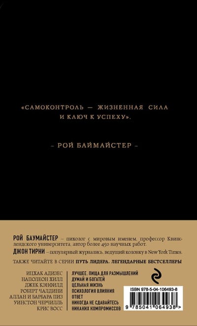 Lack of willpower is the main social pathology of our time, according to the authors of this book. Shopaholism, procrastination, low self-esteem, chronic depression, conflicts with loved ones - behind most of these problems is a lack of self-control. And, on the contrary, it is the ability to control oneself that underlies almost all success stories. Understanding this, two brilliant minds, Roy F. Baumeister and John Tierney, offer readers a simple system of self-education. It is infinitely realistic and based on the physiological characteristics of the human body. For example, the authors link manifestations of willpower with the decisions that had to be made the day before, with the level of glucose in the blood, with hormonal processes in the body. The approach of Baumeister and Tierney is a rare case when the problem is proposed to be solved not head-on, but using roundabout, often much shorter than the main, paths.