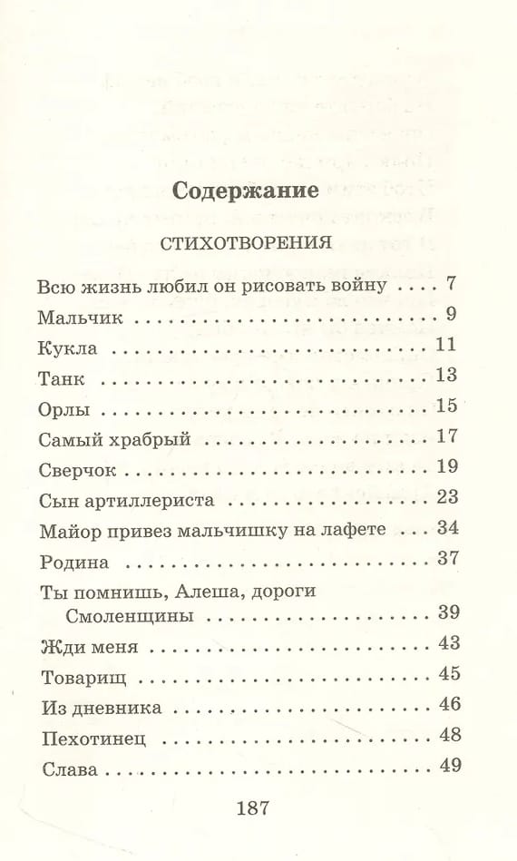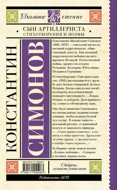 The poem "The Artilleryman's Son" (1941) tells the story of the friendship between two comrades, Deyev and Petrov. When one of them died, the other took command of the deceased's son, Lyonka Petrov, to whom Deyev became as attached as if he were his own son.