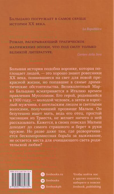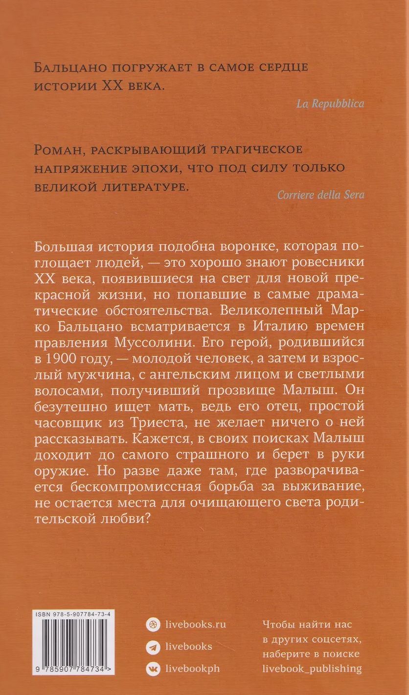 Great history is like a vortex that swallows people—this is well known to those of the 20th century, born into a new, beautiful life but caught in the most dramatic circumstances. The magnificent Marco Balzano examines Italy under Mussolini. His hero, born in 1900, is a young man, then an adult, with an angelic face and blond hair, nicknamed "The Kid." He desperately searches for his mother, as his father, a simple watchmaker from Trieste, refuses to reveal anything about her. In his search, it seems, The Kid reaches the most terrifying point and takes up arms. But is there no room, even where the uncompromising struggle for survival unfolds, for the purifying light of parental love?