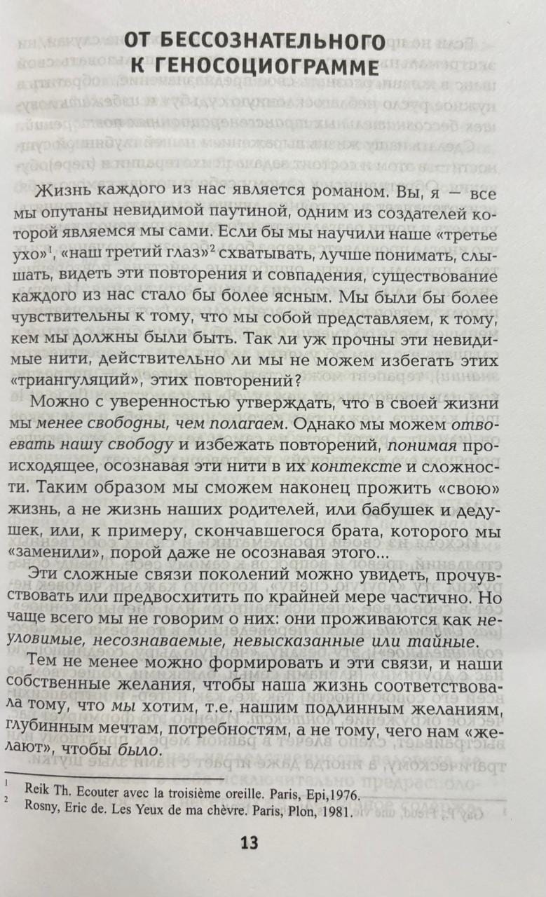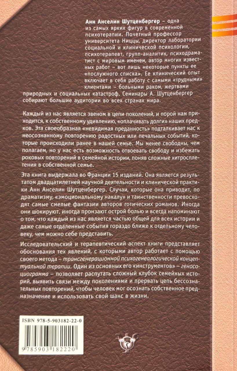 We are all links in a chain of generations, and sometimes, to our own surprise, we must "pay the debts" of our ancestors' past. This peculiar "invisible devotion to family" pushes us to unconsciously repeat pleasant situations or sad events. We are less free than we believe, but we have the opportunity to reclaim our freedom and avoid fatal repetitions in our family history by understanding the complex interplay of our own families. This book, which has gone through 15 editions in France, is the result of twenty years of research and clinical practice by Anne Ancelin Schutzenberger. The cases she cites surpass the wildest fantasies of Gothic novelists in their drama, emotional intensity, and mystery. Sometimes they shock, sometimes they pierce with acute pain, and always remind us that each of us is part of a shared history, and that even the most distant events are much closer to the individual than we might imagine. The research and therapeutic aspects of the book present the rationale for the phenomena the author addresses using her method—transgenerational psychogenealogical contextual therapy. One of her primary tools—genosociograms—allows one to unravel the complex tangle of family histories, identify connections between generations, and break the chain of unconscious repetitions, so that a person can recognize their own purpose and seize their opportunity in life.