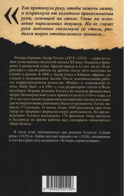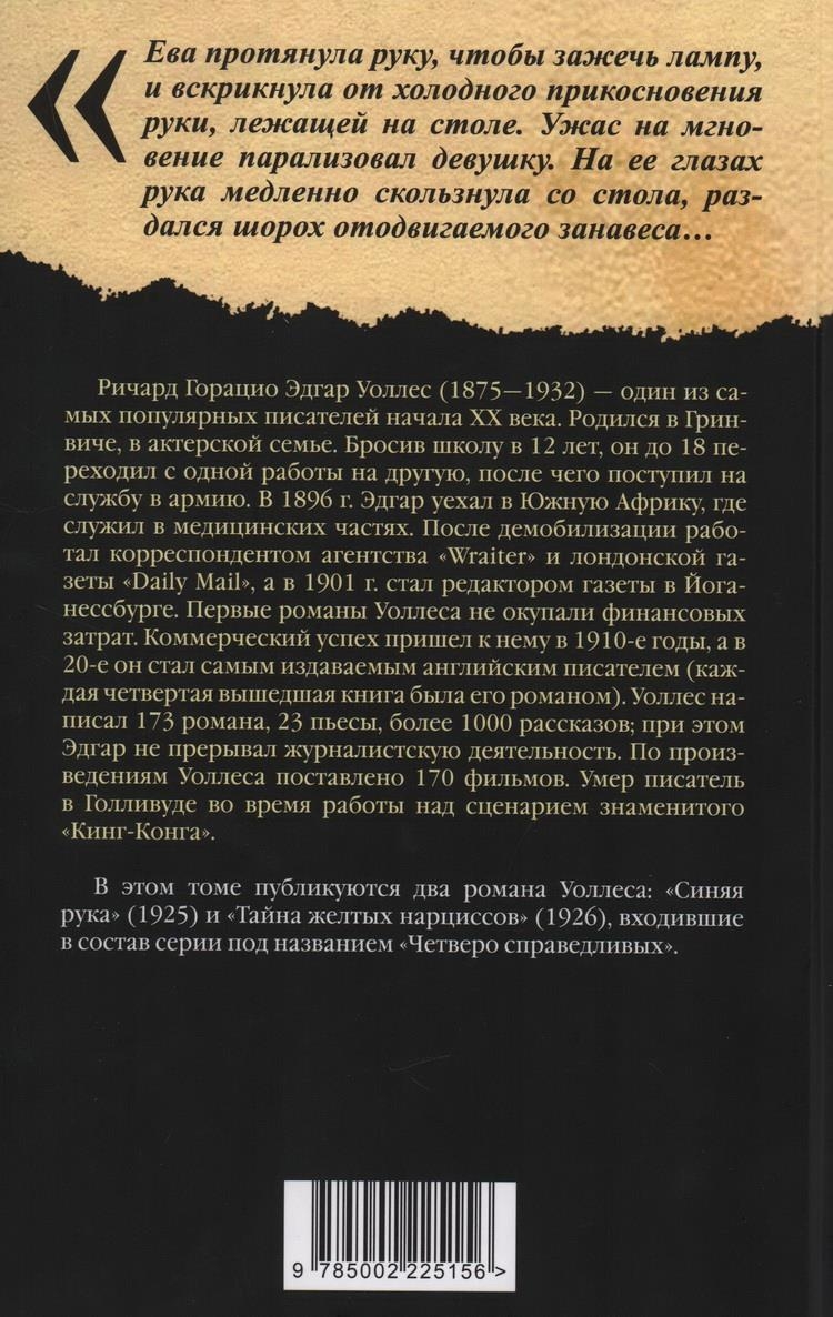 Richard Horatio Edgar Wallace (1875-1932) was one of the most popular writers of the early twentieth century. He was born in Greenwich into an acting family. Dropping out of school at the age of 12, he went from one job to another until 18, after which he joined the army. In 1896 Edgar went to South Africa, where he served in medical units. After demobilization, he worked as a correspondent for the agency "Wraiter" and the London newspaper "Daily Mail", and in 1901 became editor of the newspaper in Johannesburg. Wallace's first novels did not pay off financially. Commercial success came to him in the 1910s, and in the 20s he became the most published English writer (every fourth book published was his novel). Wallace wrote 173 novels, 23 plays, more than 1000 stories, while Edgar did not interrupt journalistic activity. On the works of Wallace put 170 movies. The writer died in Hollywood while working on the script of the famous "King Kong". This volume contains two novels by Wallace: "The Blue Hand" (1925) and "The Mystery of the Yellow Daffodils" (1926), which were part of a series called "The Four Just".