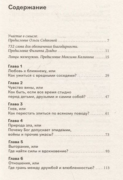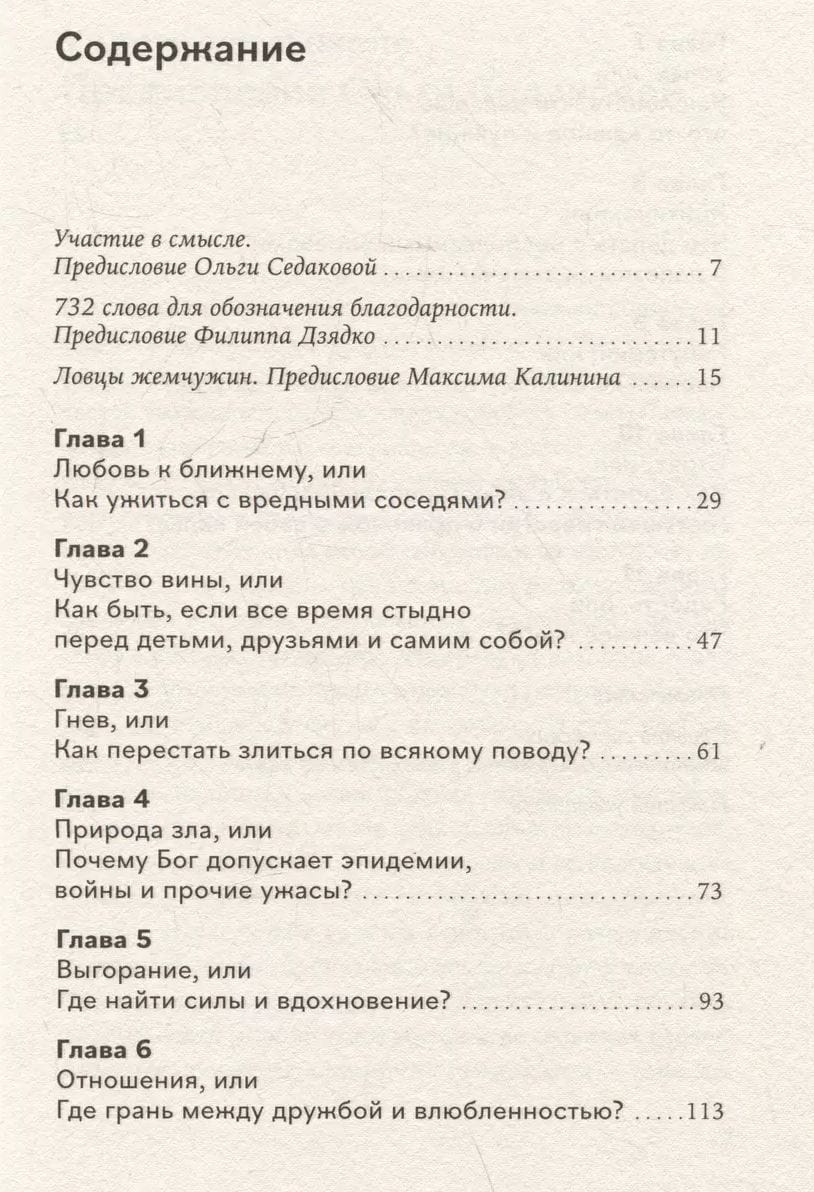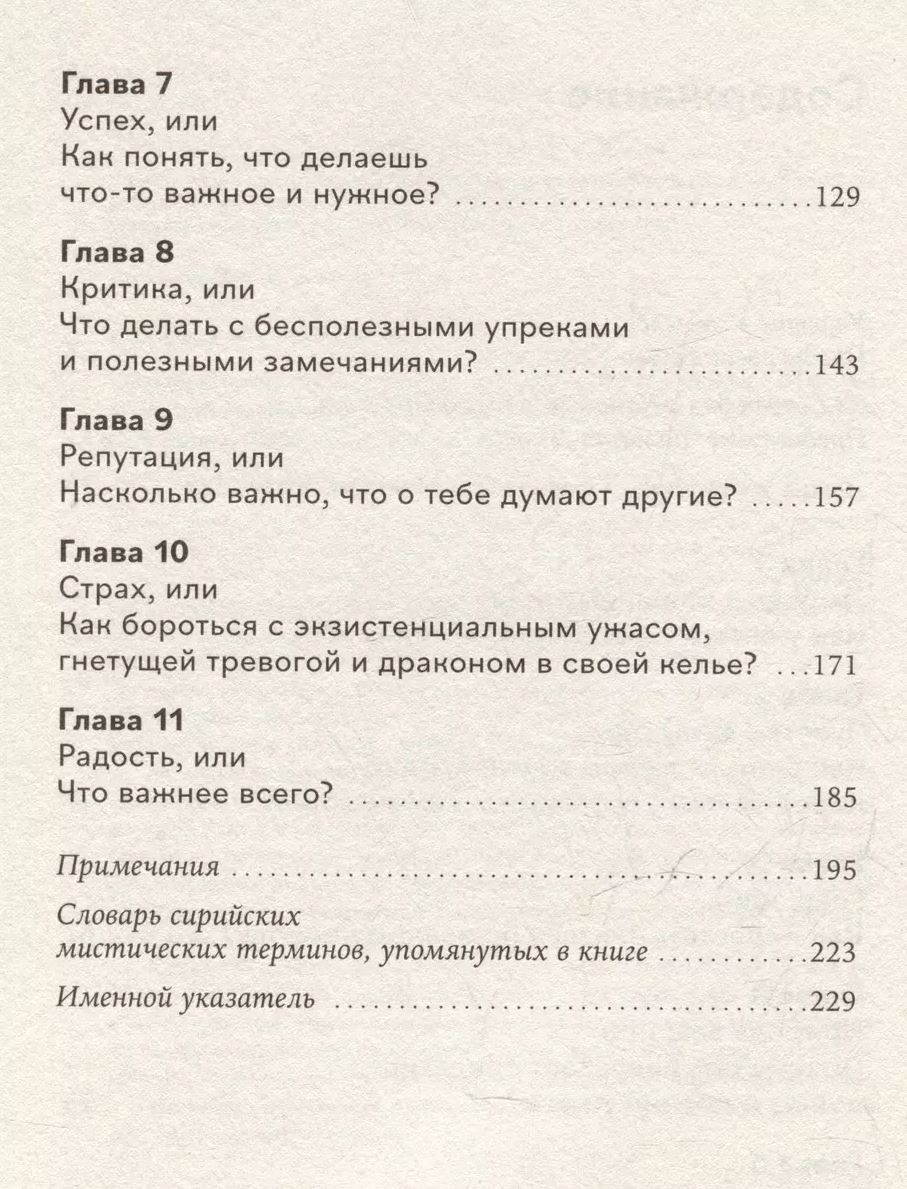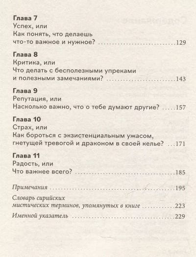 The book is built in the form of dialogue and is divided into chapters, which deal with such important topics as the nature of evil, love for others, guilt, burnout, criticism, fear, success, joy.