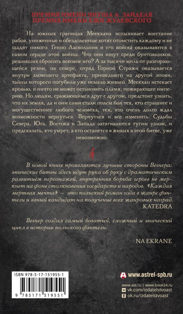 The fifth book of Tales of the Meekhan Borderland in a new edition. One of the most popular Polish fantasy cycles of our time. For all fans of The Witcher, The Lord of the Rings and A Song of Ice and Fire. The Empire is on fire. A slave rebellion is breaking out on the southern borders of Meekhan. Humiliated and destitute, the rebels seek revenge for past wrongs and spare no one. Genno Laskolnik and his squad are sent into the heart of the new war. Meanwhile, in the far north, the Mountain Guard under the command of Lieutenant Kenneth-liv-Daravit finds himself inside a sinister artifact from a very different era. And former thief Altsin explores the mysteries of the distant past. Neither of them suspects that Meekhan is becoming a battleground for those who are more fearsome and powerful than any man and who have waited a long time for the opportunity to return and change everything. The destinies of North, South, East and West are intertwined in a tangle, and it is impossible to predict who will fall in this struggle and who will survive.