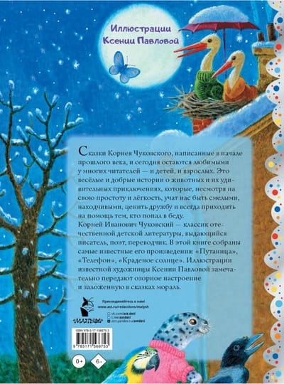 Kornei Chukovsky's fairy tales, written at the beginning of the last century, are still favorites of many readers - both children and adults. These are funny and kind stories about animals and their amazing adventures, which, despite nasvoyu its simplicity and ease, teach us to be brave, resourceful, appreciate friendship and always come to the aid of those who are in trouble.Kornei Ivanovich Chukovsky - a classic of Russian children's literature, an outstanding writer, poet, translator. This book contains his most famous works: "Tangled", "Telephone", "The Stolen Sun". Illustrations by the famous artist Ksenia Pavlova wonderfully convey the mischievous mood and the moral of the tales.