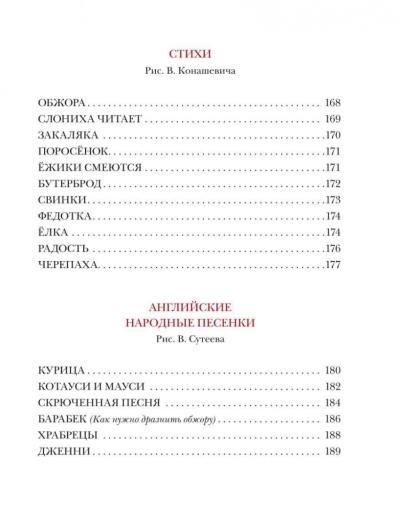 Our book is an example of a classic children's book, a gift edition of wonderful fairy tales, poems and children's English songs by the classic of children's literature Korney Ivanovich Chukovsky. Illustrations by classic artists A. Kanevsky, V. Konashevich, V. Suteev. In the book children's favorite fairy tales about the kind Dr. Aibolit, about Fly Tzokotukha and her brave savior Komarik, about the terrible Crocodile, swallowed the sun in the sky, about Fedorino grief, cheerful, kind poems about poor Fedotka, about the terrible Zakalyaka, English songs about a beautiful chicken, about cunning Kotausi and clever Mausi, about glutton Barabek....