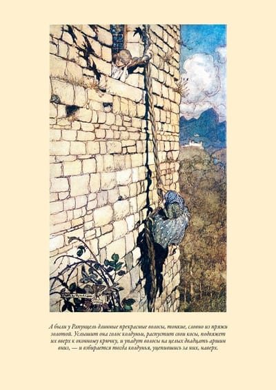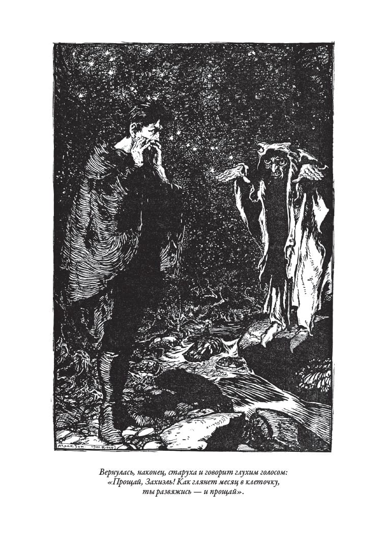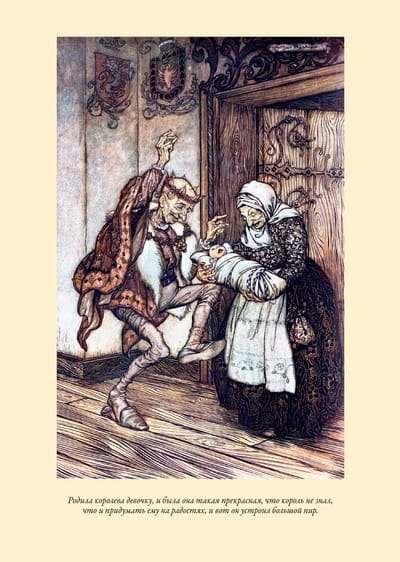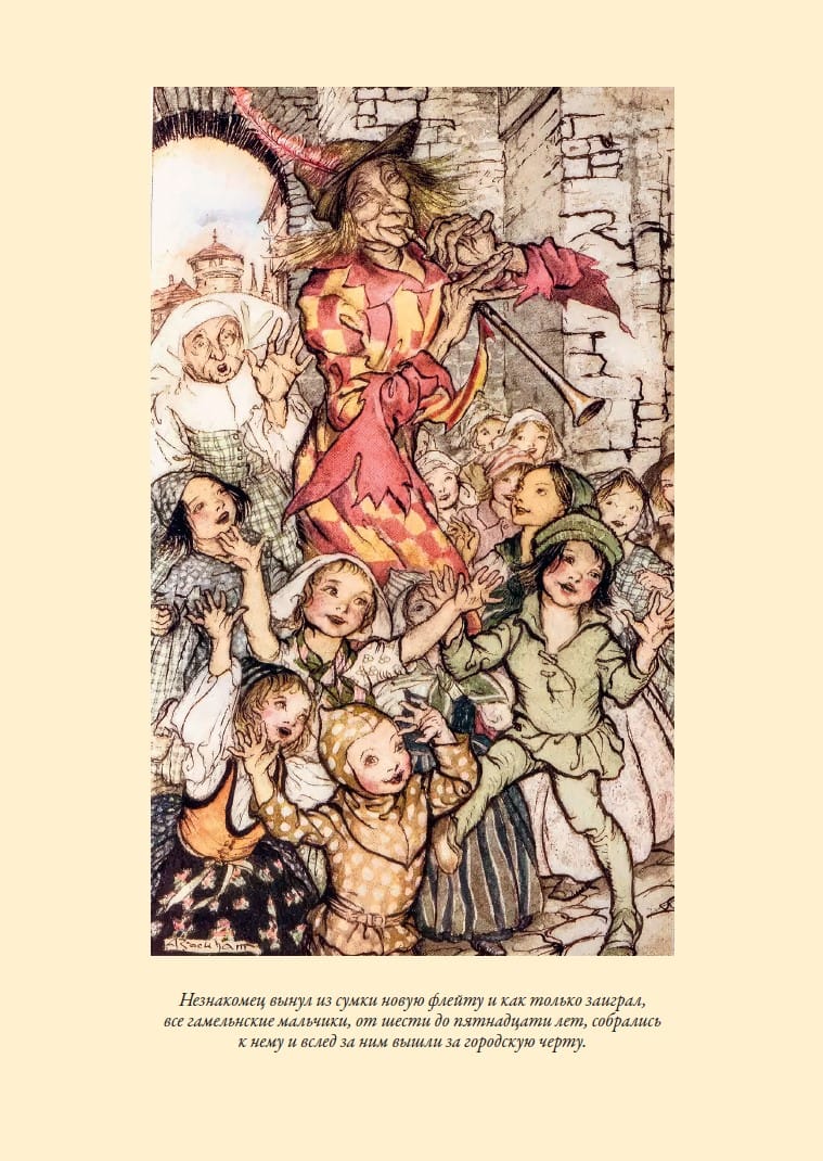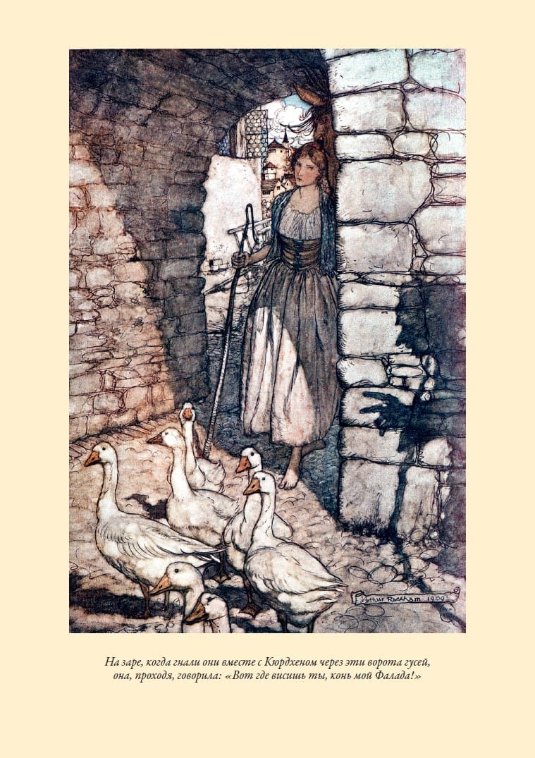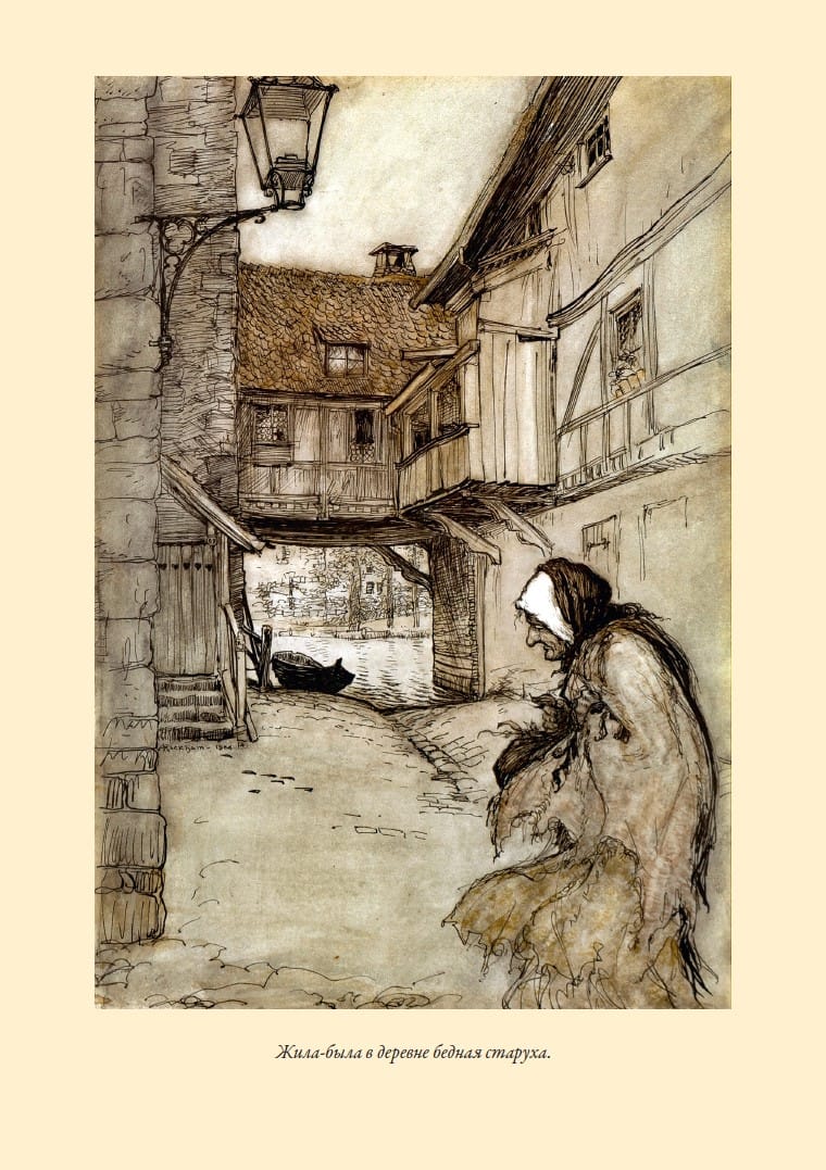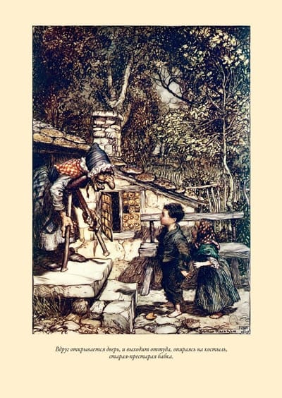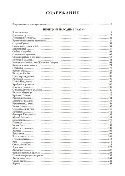 The edition includes one hundred and two German folk tales in the presentation of famous linguists and folklorists brothers Jacob Grimm (1785-1863) and Wilhelm Grimm (1786-1859). All tales are given in translation by Grigory Petnikov. At the end of the collection to the fairy tale "Children from Hammeln" is a transposition of the legend of the Pied Piper by Prosper Merimee translated from French by Anatoly Vinogradov. The edition is decorated with magnificent black-and-white and color drawings by the famous British artist Arthur Rackham, who is deservedly considered the outstanding master of the Golden Age of British book illustration.