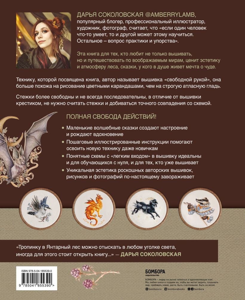 Daria Sokolovskaya AmberryLamb - a popular blogger, professional illustrator, artist, photographer - believes that "if one person knows how to do something, another person can learn it too. The rest is a matter of practice and persistence." She takes the reader by the hand and leads him into her mysterious Amber Forest, which she created with her own imagination and, of course, her hands! There is a wonderful tree house, talking animals and birds, there is magic at every step. And thanks to this book, the wonders of the Amber Forest will forever settle on the collar of your dress or on the wall of your room. You won't be able to resist embroidering a portrait of a cunning fox or a charming cat. And, of course, master the unique author's technique of "free hand embroidery". Sit next to the children and immerse yourself in the world of a magical fairy tale! The hoops and needle and thread are already waiting for you!