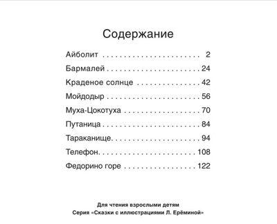 We all know and love Kornei Chukovsky's fairy tales from childhood. But even the texts, which you know almost by heart and can easily quote, will play with completely new colors thanks to the illustrations of a wonderful artist - Lyubov Yeremina. Her style cannot be confused with any other: her characters are expressive, emotional and so lively that the child will be doubly interested in reading the tales of Kornei Chukovsky. Enjoy with your child the drawings that you want to see in detail!