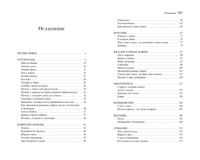 Equally interesting is the collection "Tales of the Peoples of Africa." It contains stories of the Hottentots, Zulus, Bechuanas, Ovagereros, Somalis, and other African peoples. The tales tell of monsters and sorcerers, cannibals and animals, and wondrous adventures. Africans seek answers to questions such as: how was the world created, where did diseases come from, why does the jackal have a variegated stripe on its back?