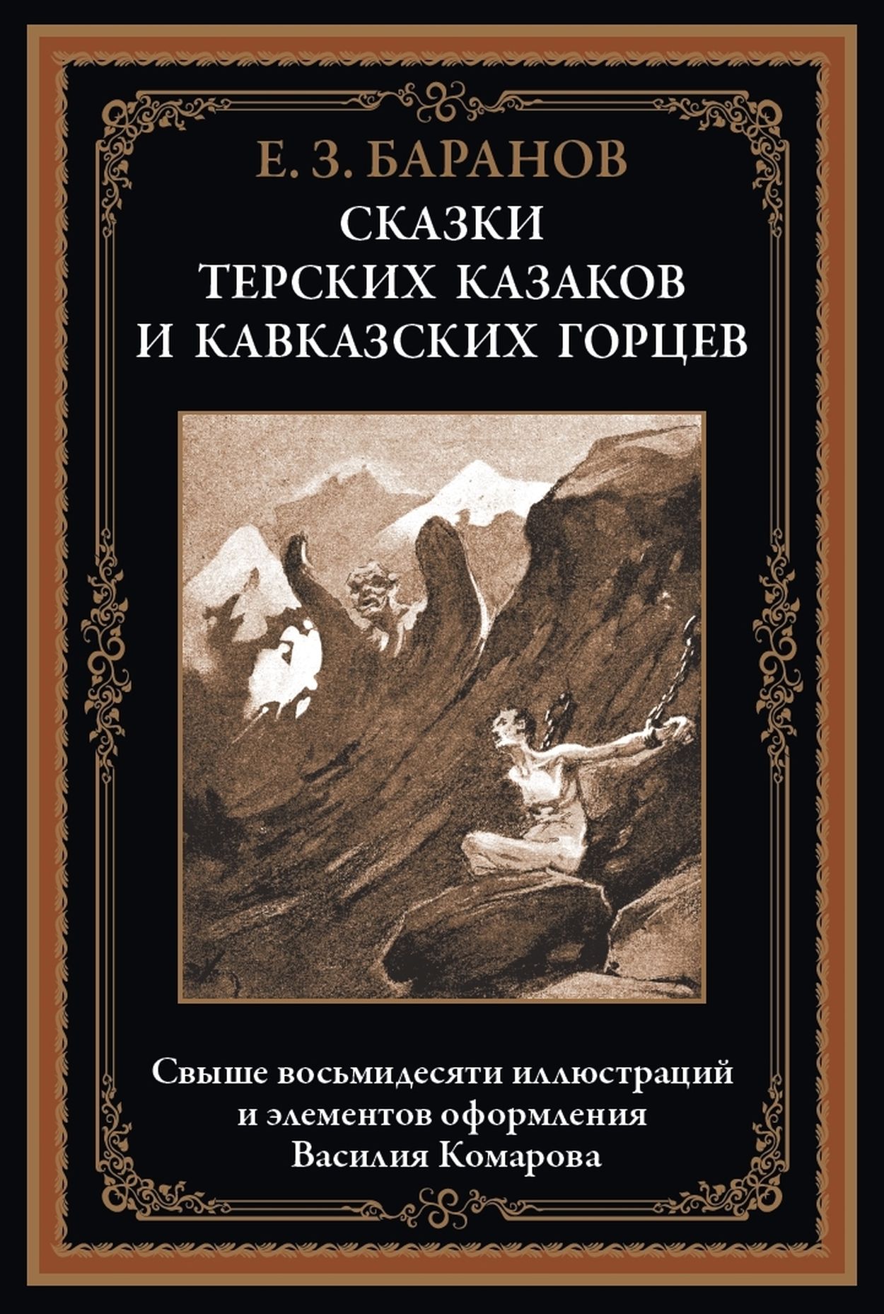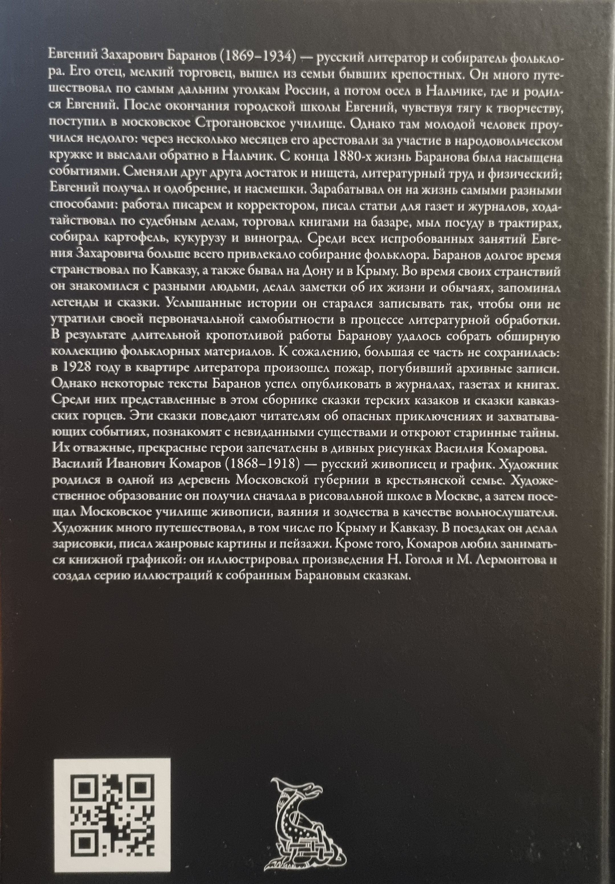 Yevgeny Zakharovich Baranov (1869–1934) was a Russian writer and folklore collector. His father, a small trader, came from a family of former serfs. He traveled extensively throughout the farthest corners of Russia, and then settled in Nalchik, where Yevgeny was born. After graduating from a city school, Yevgeny, feeling a craving for creativity, entered the Moscow Stroganov School. However, the young man did not study there for long: a few months later he was arrested for participating in a Narodnaya Volya circle and sent back to Nalchik. From the late 1880s, Baranov’s life was eventful. Wealth and poverty, literary and physical labor alternated; Yevgeny received both approval and ridicule. He earned his living in a variety of ways: he worked as a clerk and proofreader, wrote articles for newspapers and magazines, petitioned for court cases, sold books at the market, washed dishes in taverns, and picked potatoes, corn, and grapes. Of all the activities he tried, Yevgeny Zakharovich was most attracted to collecting folklore. Baranov traveled around the Caucasus for a long time, and also visited the Don and Crimea. During his travels, he met different people, took notes on their lives and customs, and memorized legends and fairy tales. He tried to write down the stories he heard so that they would not lose their original originality in the process of literary processing. As a result of long, painstaking work, Baranov managed to collect an extensive collection of folklore materials. Unfortunately, most of it has not survived: in 1928, a fire broke out in the writer's apartment, destroying the archival records. However, Baranov managed to publish some of his texts in magazines, newspapers and books. Among them are the tales of the Terek Cossacks and the tales of the Caucasian highlanders presented in this collection. These tales will tell readers about dangerous adventures and exciting events, introduce them to unseen creatures and reveal ancient secrets. Their brave, beautiful heroes are captured in the wonderful drawings of Vasily Komarov.