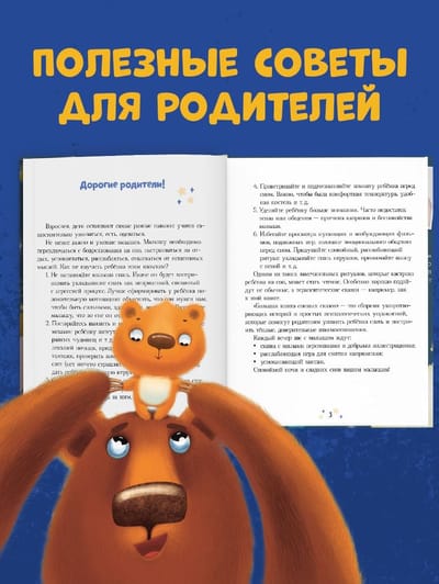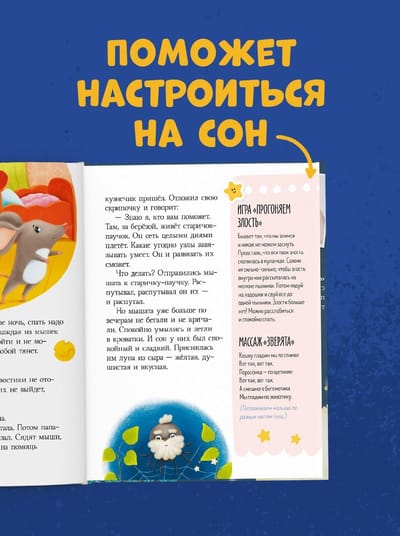 Chapters with fairy tales are accompanied by simple psychological exercises and tactile games. You will do a massage, depicting dripping rain, or draw on your palms, gently relaxing the baby and helping him get rid of negative thoughts and switch from wakefulness to sleep.