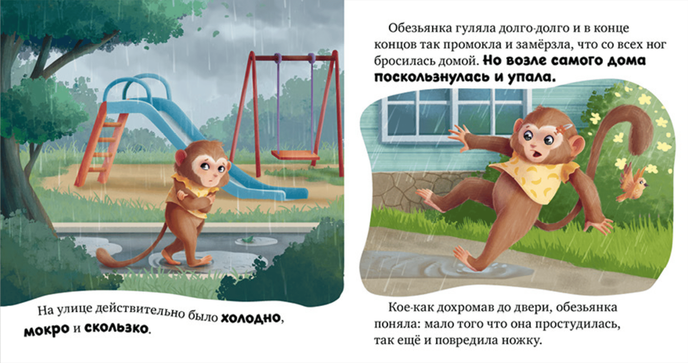 The little monkey was very afraid of doctors and disobeyed her mother. One day, she ran off without asking. It was raining outside, and the monkey became very cold and sick. Will she be able to overcome her fear and go to the hospital?