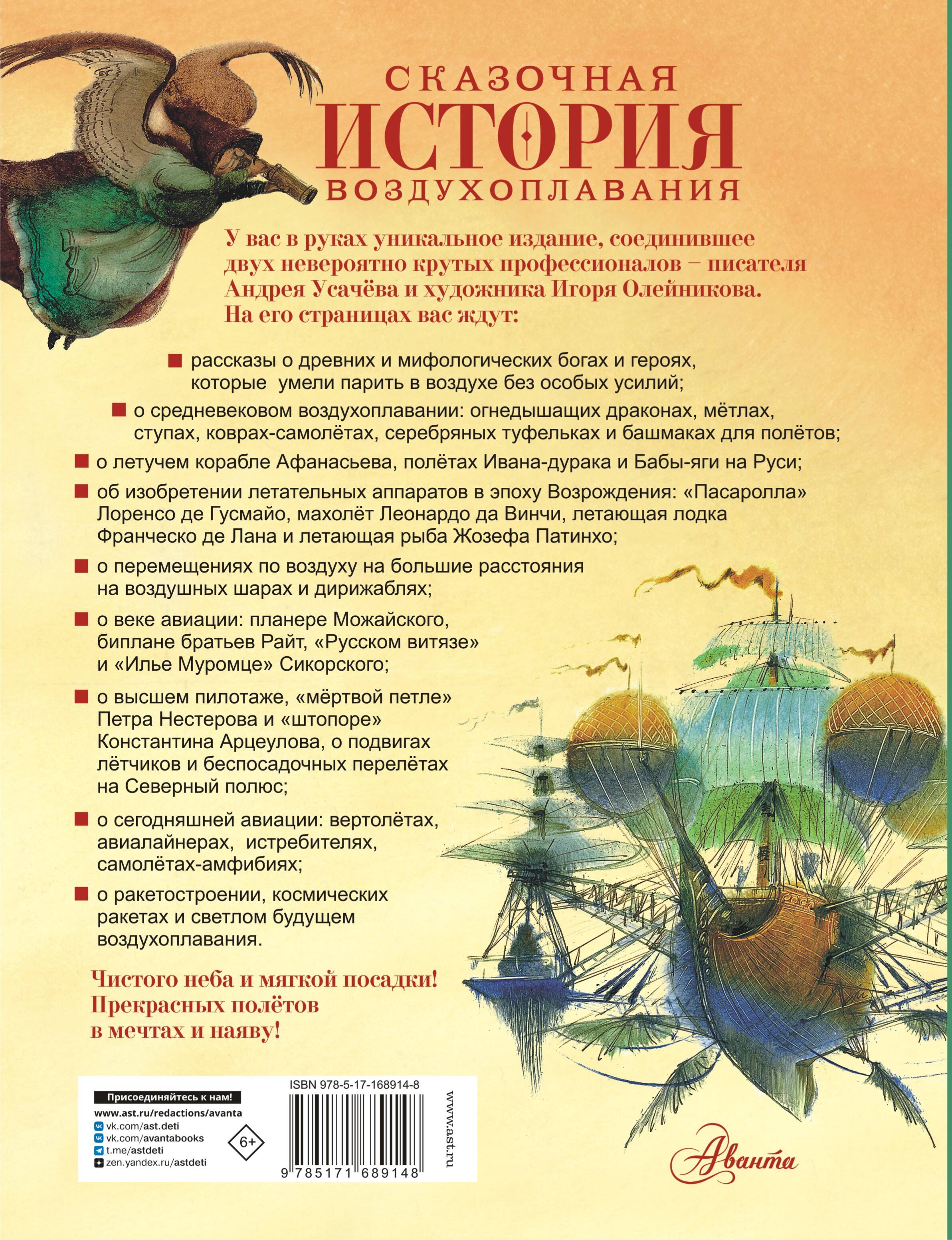 You are holding in your hands a full-fledged encyclopedia dedicated to aeronautics. It contains the history of aeronautics (from Renaissance aircraft, balloons and airships to jet aircraft and space rockets), and stories about the age of aviation, about gliders and biplanes, as well as about the amazing feats of pilots. In addition, about myths, legends and literary works, whose heroes fly using flying carpets and mortars, birds and cannonballs, umbrellas and motors, and even completely unusual means...