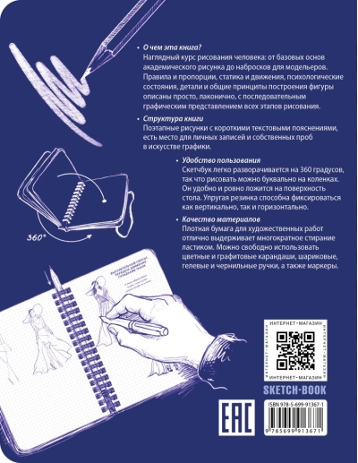 This is a modern book. It's designed for those seeking new forms of creative expression. It's a practical book. Take notes, plan tasks, record lectures—and draw alongside: create and unwind. This is a convenient book. It lies flat on the table and can be turned 360 degrees. It has beautiful, thick paper that doesn't let paint bleed through. Frame-by-frame drawings are an unobtrusive introduction to basic drawing skills.