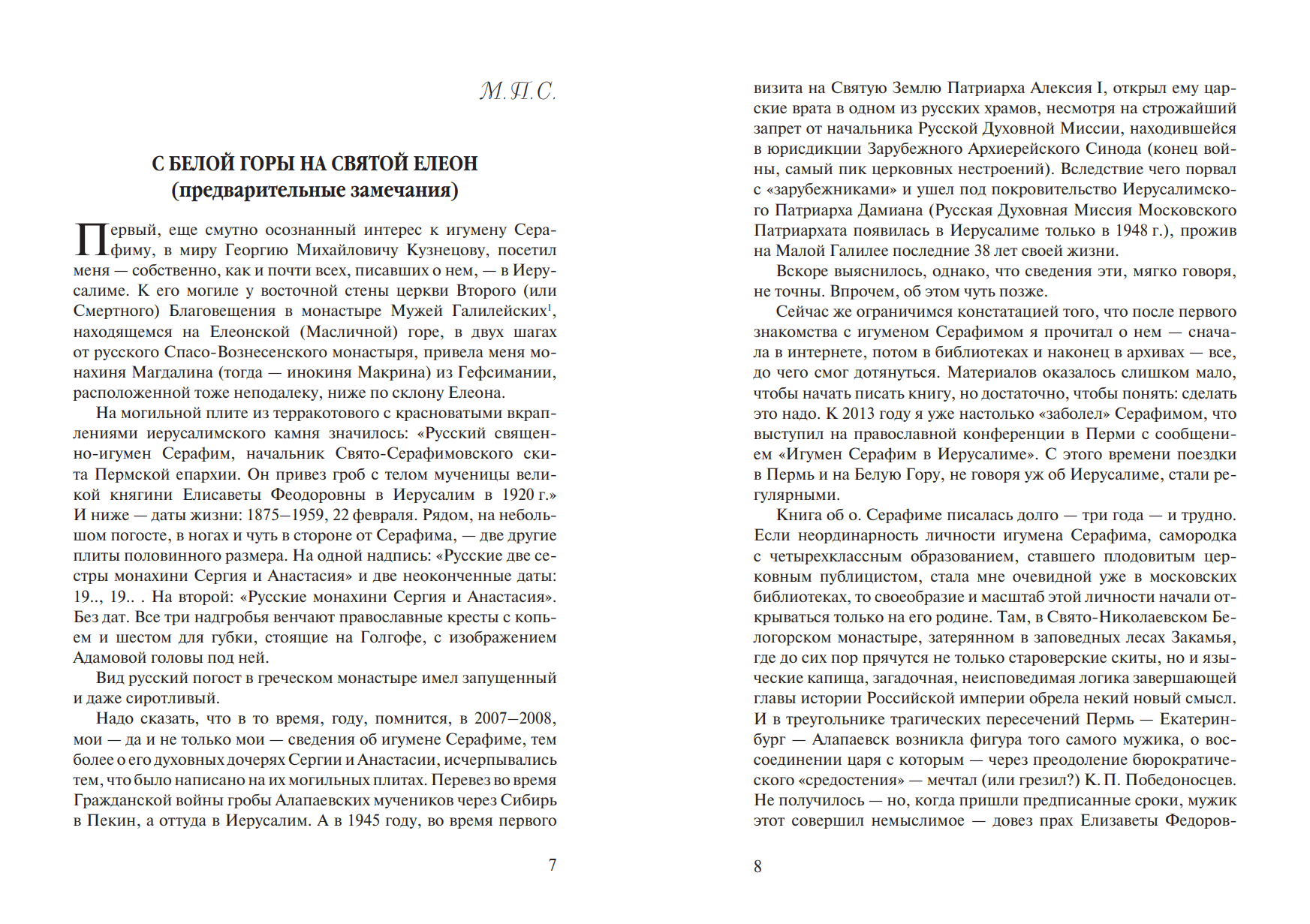 This book is dedicated to the life of Hegumen Seraphim (Kuznetsov), who evacuated the coffins of the Alapaevsk Martyrs from the Urals in 1919–1920, crossing the front lines of the Civil War, and delivered the relics of Grand Duchess Elizabeth Feodorovna and her cell attendant, Varvara (Yakovleva), to Jerusalem. The biography of Hegumen Seraphim and his deep spiritual connection with the founder of the Martha and Mary Convent are examined against the backdrop of the broader tragic end of the Russian Empire and the role of the Romanov dynasty in it. It details the spiritual struggle of Hegumen Seraphim, who spent the last 38 years of his life in Jerusalem on the Mount of Olives, next to the Church of St. Mary Magdalene, where the relics of the Holy Martyrs Elizabeth and Varvara are laid to rest. Before us lies a half-unveiled mystery: a lone Russian monk who contained within himself and preserved for us all a great and holy Russia.