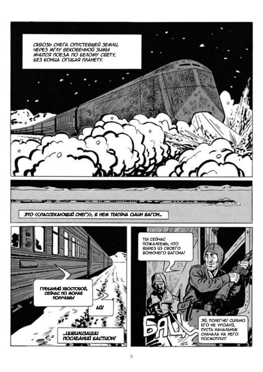 An ecological catastrophe has plunged the world into a new ice age. The last stronghold of mankind is a unique autonomous train, which has been traveling around the planet for many years and protecting passengers from the deadly cold. The world of this train is hierarchical and unfair: at the head of the train are golden cars for the aristocracy, which enjoys all the benefits of the new life, and at the tail are miserable existence and the poor die of hunger and disease. The post-apocalyptic world of the graphic novel "Through the Snow" was the basis for the plot of the movie of the same name by Pong Joon Ho, released in 2013. This edition contains unique sketches and sketches by Jean-Marc Rochette, commissioned by the director especially for the movie. Also based on the comic book is a TV series starring Jennifer Connelly. It premiered in May 2020 on Netflix. The edition includes Jacques Lob's graphic novel Through the Snow (1982) and the continuing narrative of life on the train comics The Wanderer (1999) and The Crossing (2000), written by Benjamin Legrand. The artist for the entire series is Jean-Marc Rochette.