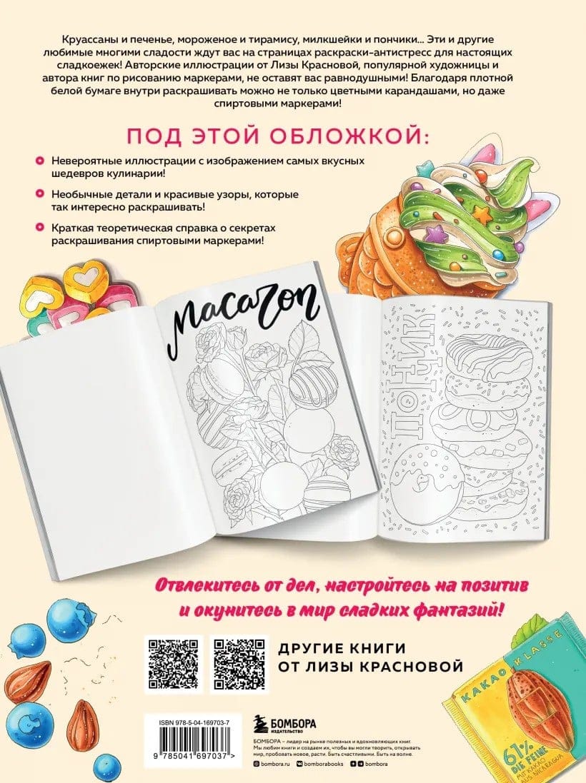 Have you long wanted to sweeten your everyday life and fill your life with bright colors? Coloring-anti-stress "Sweet Fantasies" - what you need! Exotic fruits, chocolate desserts, warming drinks, fragrant pastries - all this awaits you on the pages of coloring pages from Lisa Krasnova, a popular artist and author of drawing books "Markers! All About Color, Materials and Sketches" and "Coloring with Markers with Lisa Krasnova. Step-by-step lessons", whose drawings have conquered the Russian-speaking Internet.